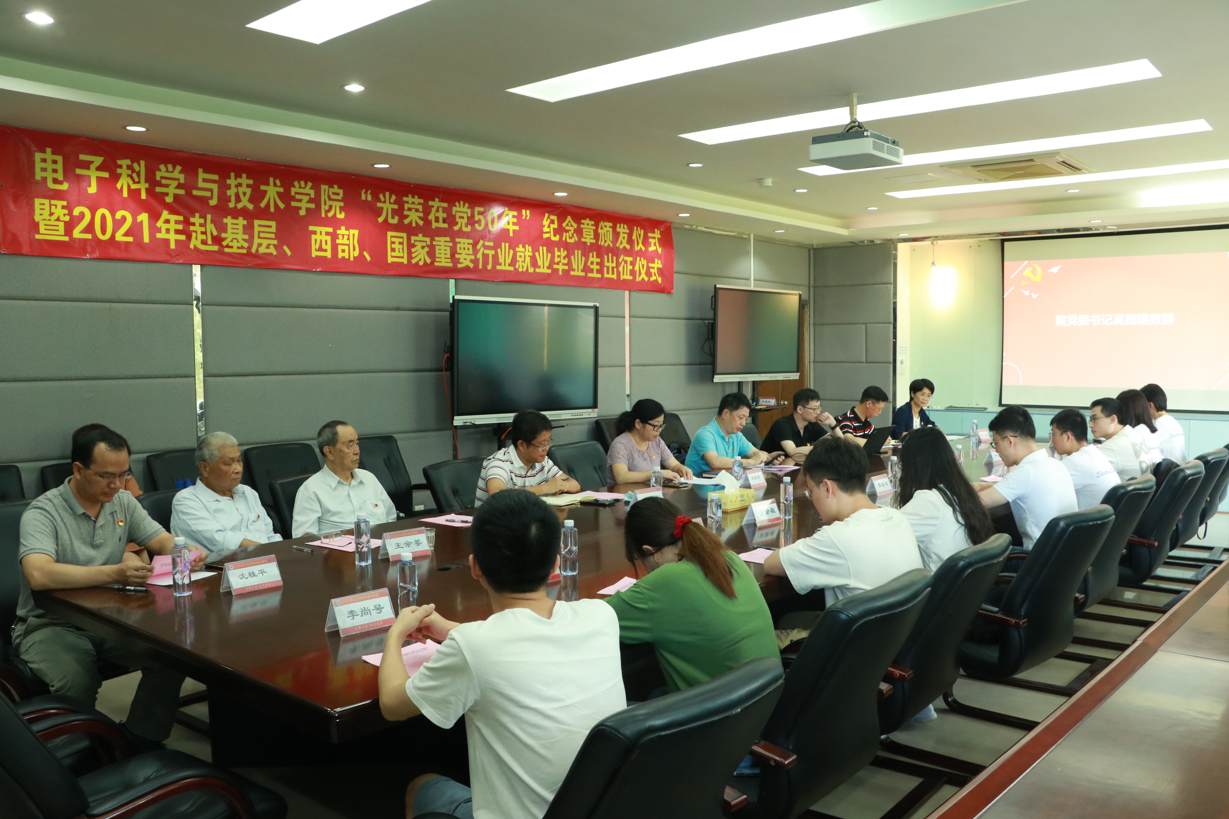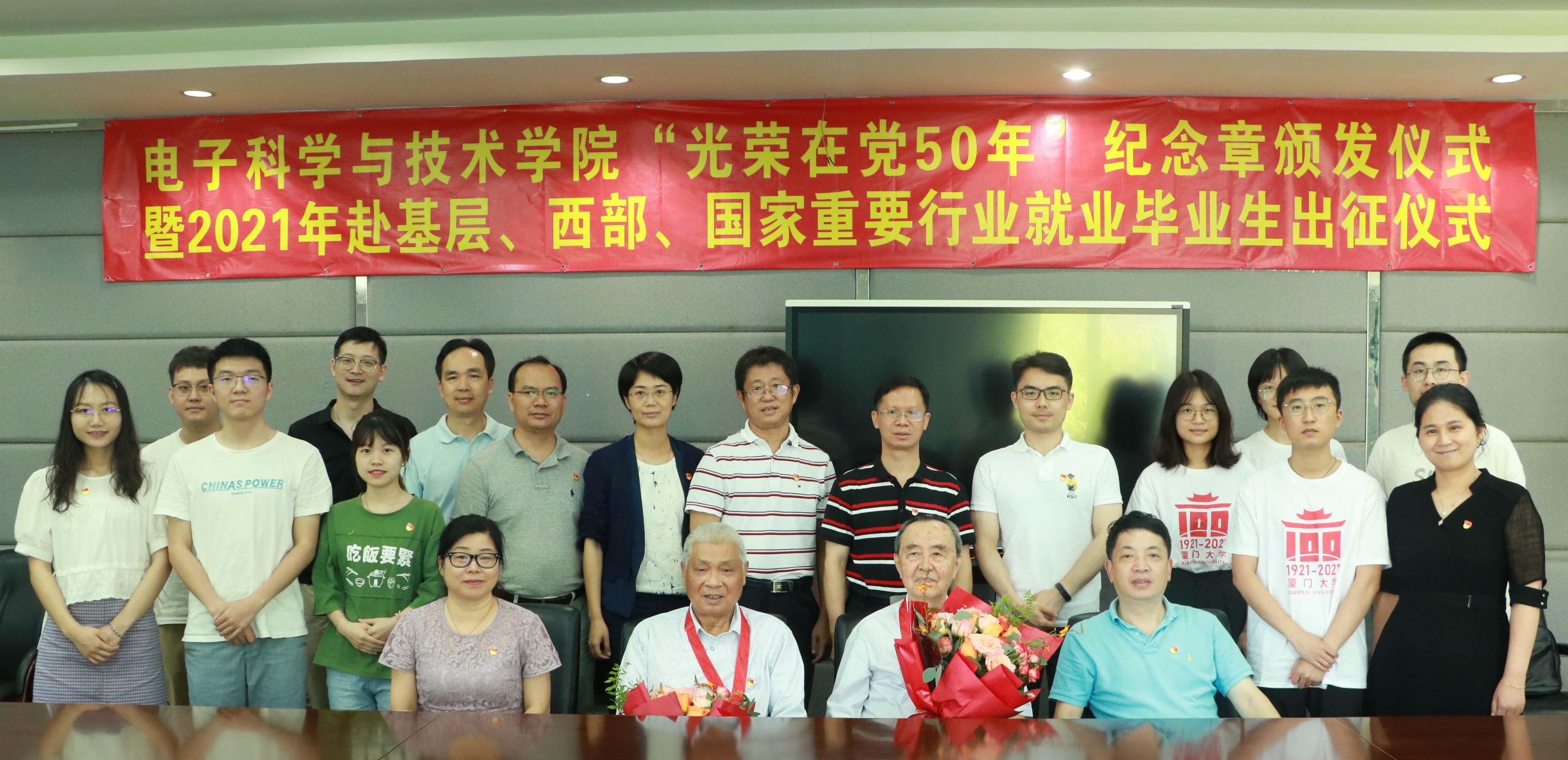 6月17日下午,电子科学与技术学院“光荣在党50年”纪念章颁发仪式暨2021年赴基层、西部、国家重要行业就业毕业生出征仪式在海韵园行政楼A306会议室举行。获颁纪念章的老党员代表陈荣钦、王余姜,校党史学习教育第七指导组副组长洪真裁,院党委书记吴国瑛、院长陈忠,院党委副书记方银水、郑莉,工会主席沈桂平等学院领导,团委书记韩海雄、团委副书记刘锦锗以及赴基层、西部、国家重要行业就业毕业生代表等参加仪式。