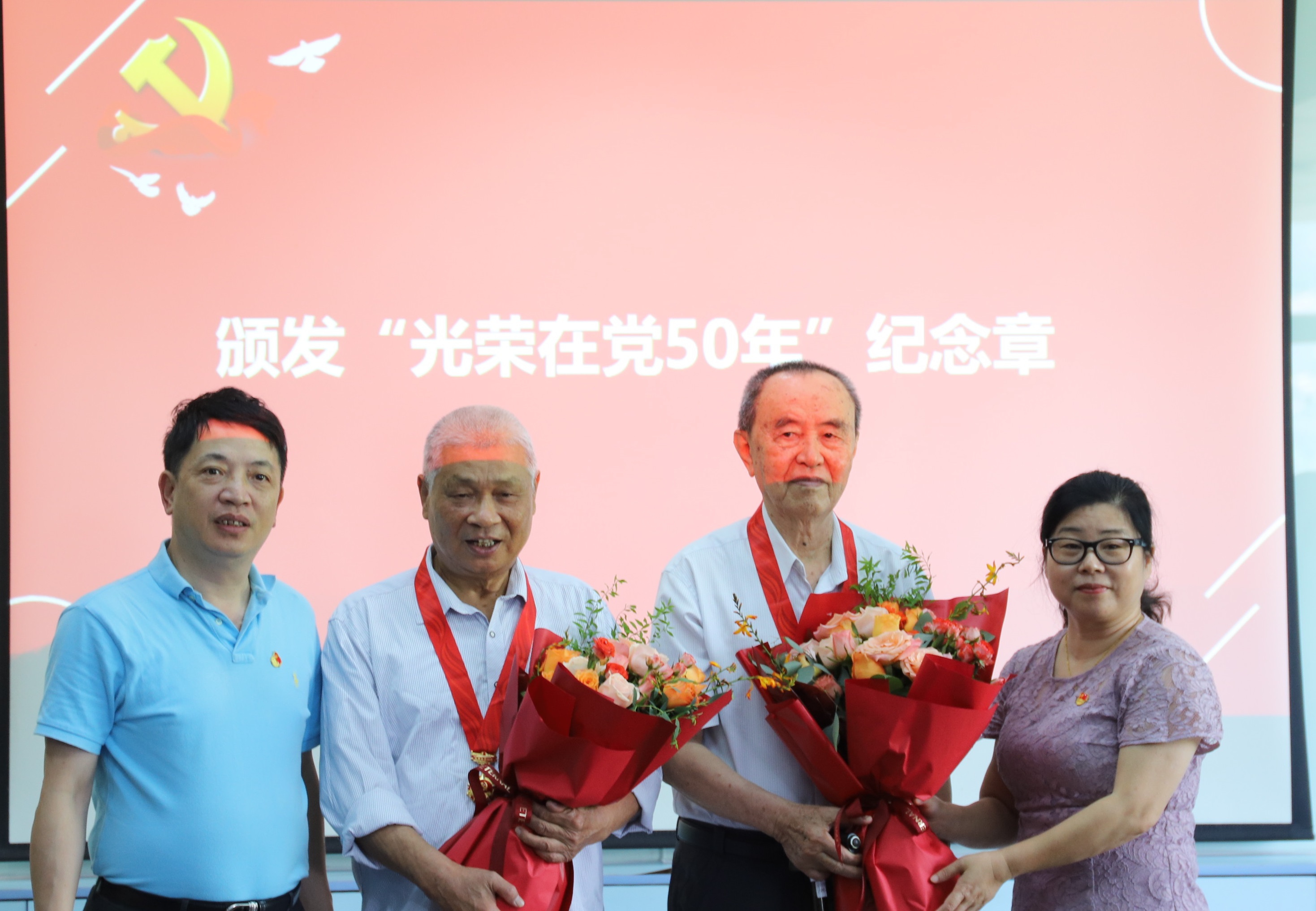 吴国瑛、陈忠为老党员代表颁发“光荣在党50年”纪念章,毕业生向他们献花致敬。