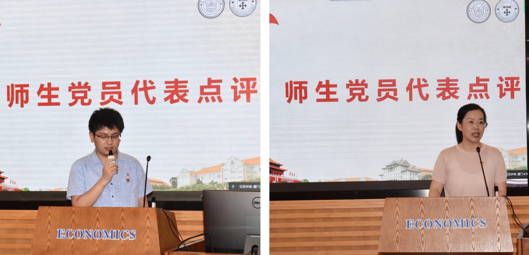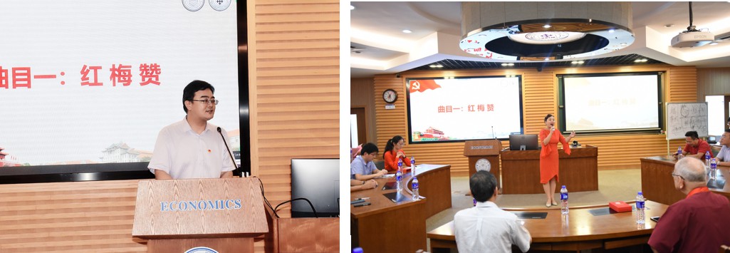 “红梅花儿开,朵朵放光彩……”6月23日中午,经济学院C208教室红歌飘扬、激情澎湃,这是经济学院党委第一期“师说百年·红色引航”师生共建党支部示范党课观摩点评会活动现场。著名金融学家、教育家,金融系退休教师党员张亦春教授,经济学院党委书记黄鸿德、副书记杜海林,经济学院副院长朱孟楠教授与承办本次党课的金融系教师党支部,金融系2019级、2020级硕士研究生各党支部共同学习了这堂音乐党课,党课同时面向全院师生直播。金融系2019级硕士研究生第二党支部书记林祎楠主持本次学习。
