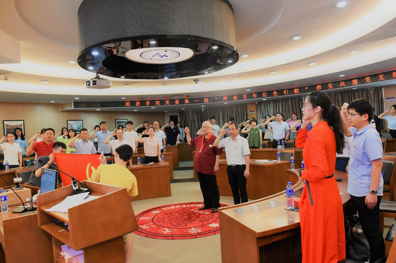 最后,在张亦春教授和黄鸿德的带领下,全体党员在党旗下庄严举起右拳,一同重温入党誓词。