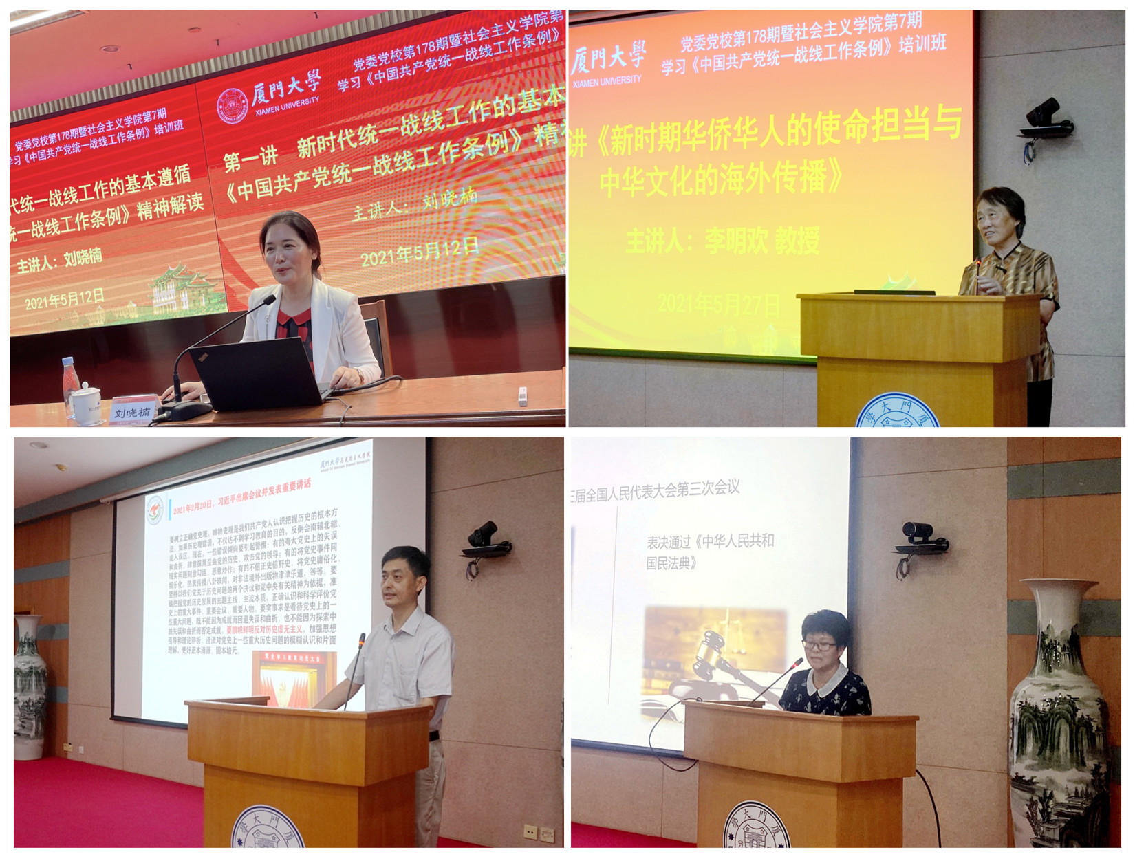 在此次实践教学前,培训班还在校内举办了四场专题讲座,既深入开展党史学习教育,又深入掌握《条例》精神实质,分别邀请福建省社会主义学院刘晓楠教授作《新时代统一战线工作的基本遵循——<中国共产党统一战线工作条例>精神解读》报告、厦门大学公共事务学院李明欢教授作题为《新时期华侨华人的使命担当与中华文化的海外传播》报告、厦门大学马克思主义学院张有奎教授作题为《旗帜鲜明反对历史虚无主义》报告、福建师范大学协和学院杨林香教授作题为《意识形态领域突出热点与建设引领解析》报告。