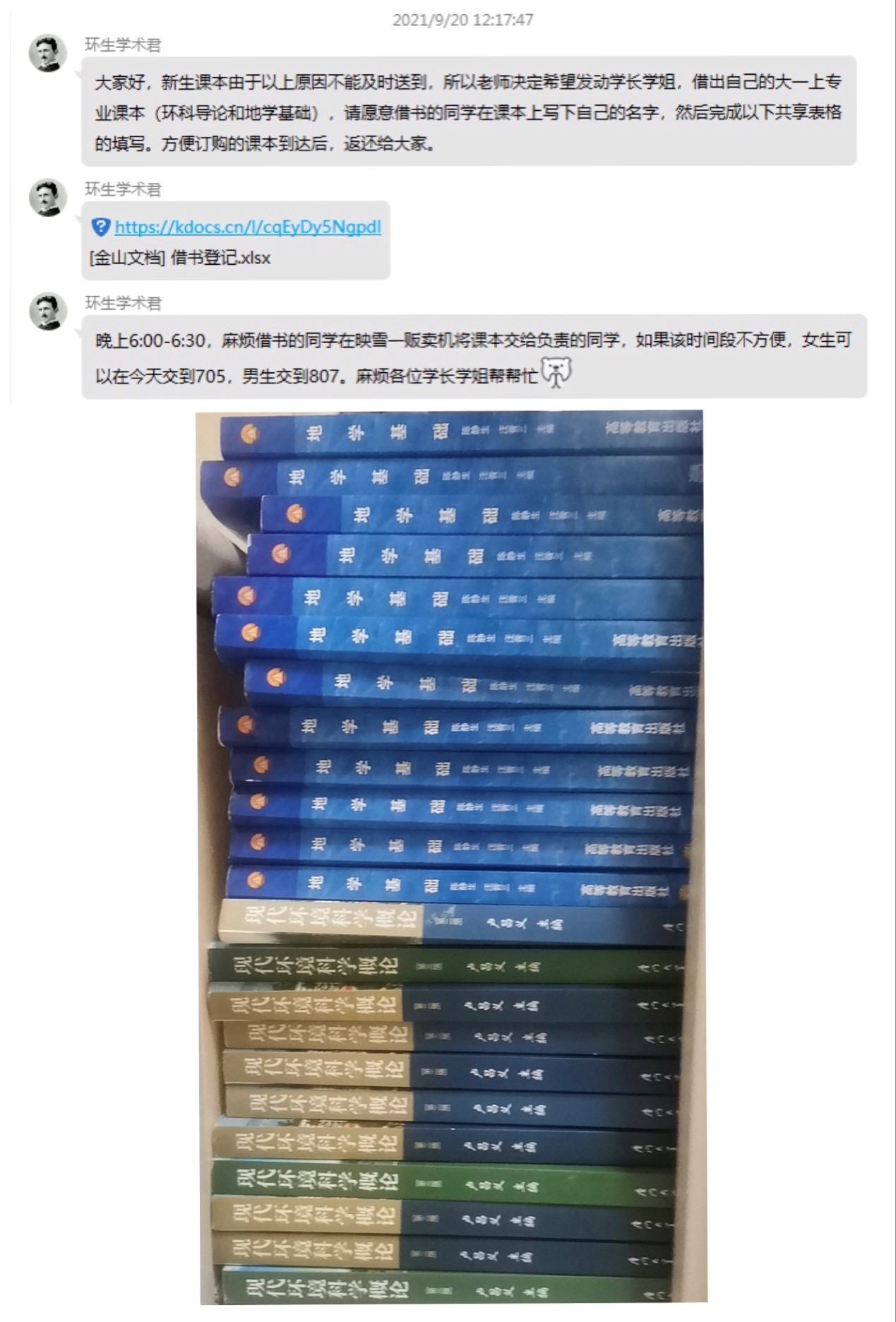 因受疫情影响,2021级本科新生的《环境科学导论》和《地学基础》两门课程的课本无法按期提供给学生。为了保证学生正常学习,本科生党支部组织党员、入党积极分子发动老生,共借出80余本教材给新生,以解燃眉之急,确保学习顺利进行。