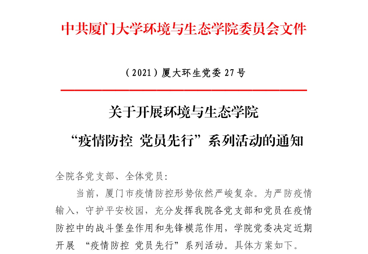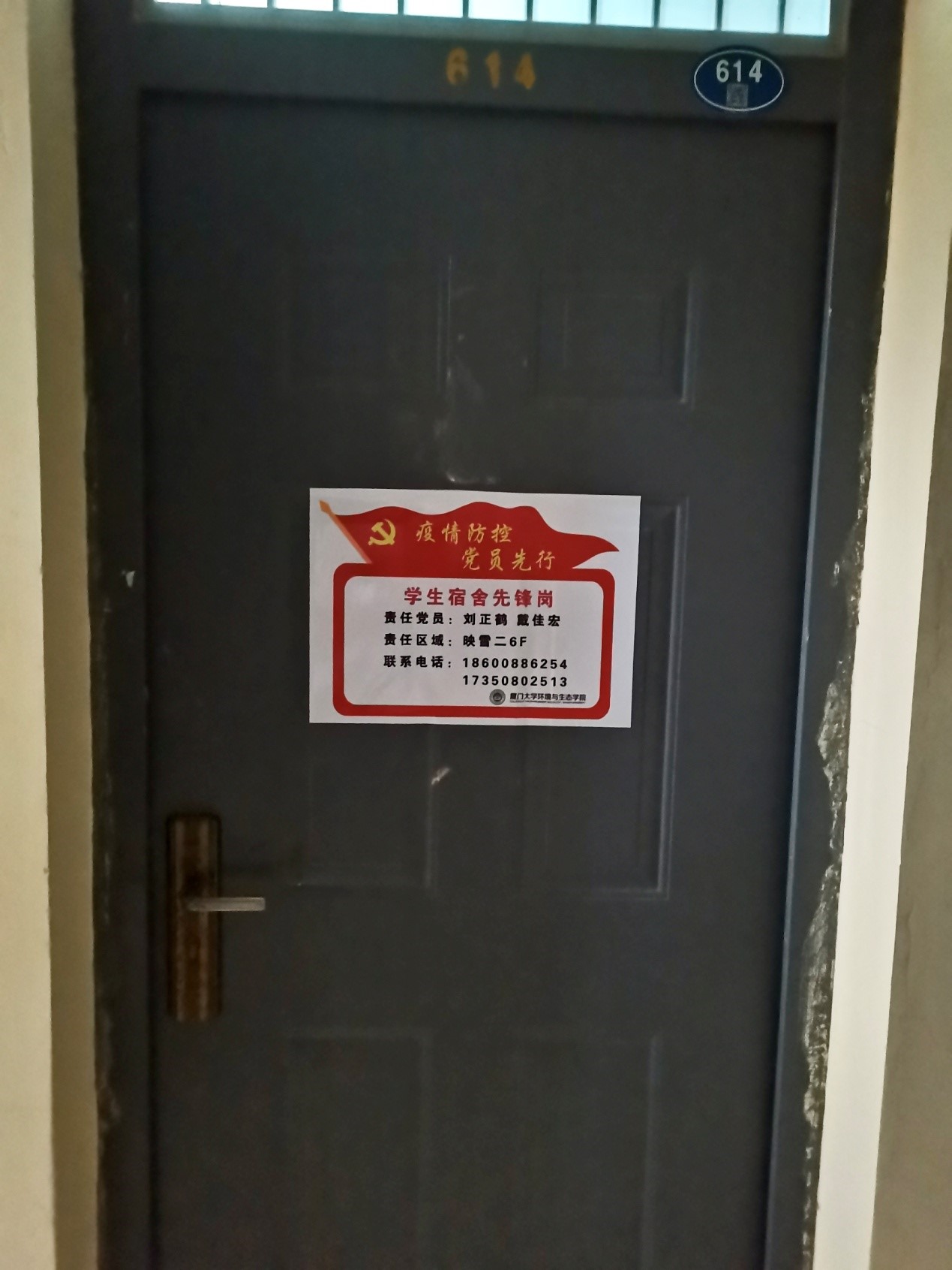 当前,厦门市疫情防控形势严峻复杂,为严防疫情输入,守护平安校园,9月18日,环境与生态学院党委第一时间启动“疫情防控 党员先行”系列活动,通过设立“线上教学先锋岗”“学生宿舍先锋岗”“健康信息先锋岗”“爱心保障先锋岗”四个先锋岗,搭建三级网格管理系统,成立若干突击队,开展多样活动等,组织广大党员积极投身疫情防控工作中,用自己的行动让党旗在疫情防控歼灭战的第一线高高飘扬,让党徽在疫情防控阵地上熠熠生辉。