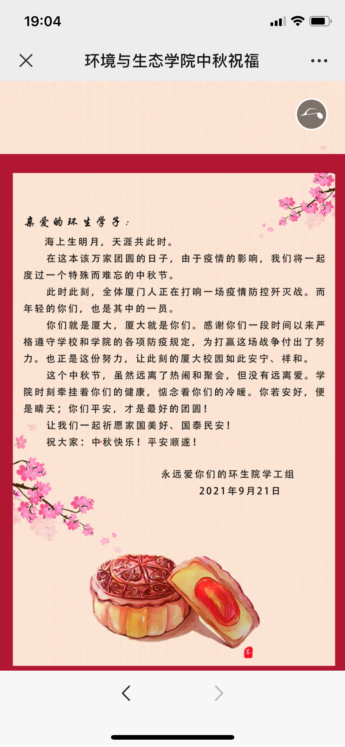在刚刚过去的中秋节当天,学院学工组给全体学生送上电子贺卡,云寄祝福,并举办线上中秋晚会,院领导、辅导员、班主任与学生共度佳节。接下来,各支部还将参与组织线上运动会、线上知识竞赛等活动,丰富学生们的业余生活。