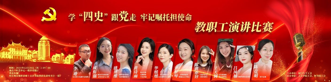 为激发广大教职工以更加昂扬的斗志,将学习成果转化为立足本职岗位作贡献的实际行动,校工会联合人文学院部门工会、图书馆部门工会举办“学‘四史’跟党走·牢记嘱托担使命”教职工演讲比赛。举办线上初赛和线下决赛,前后历时两个多月,基层部门工会积极响应并对参赛作品进行把关指导,从23个部门工会推荐的30余名选手中,评选出10名选手进入决赛,选手们用深情的语言颂扬建党100年来的伟大成就,颂扬一代又一代厦大人立足自身岗位担当作为的感人故事。国际中文教育学院/海外教育学院部门工会举办“学党史,诵经典”诗文诵读比赛、法学院部门工会举行“党员开讲啦”党史故事演讲比赛等,唱出了工会在“四史”学习教育中的好旋律,全面展现厦大人一心跟党走、奋进新时代的良好精神面貌。