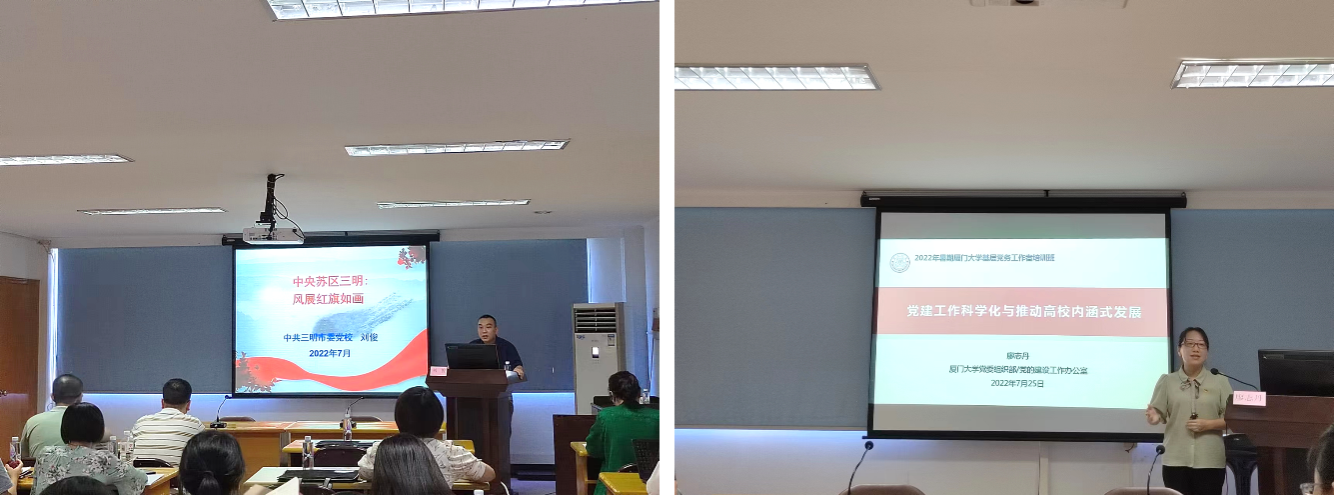 为加强学员们把握三明苏区“一区三地”的重要历史地位和在中共革命史和党史上的重要贡献,邀请三明市委党校统一战线与文化教研室主任刘俊讲授《中央苏区三明:风展红旗如画》专题报告。他从毛泽东同志《如梦令·元旦》的创作背景引入,围绕三明作为中央苏区的核心区、中央红军长征的四个出发地之一、红旗不倒的革命根据地、伟人革命的重要实践地等四个方面逐一展开,生动阐释了苏区精神的深刻内涵。同时,为进一步指导基层党务工作者贯彻落实新时代党的建设总要求,校党委党的建设工作办公室主任兼组织部副部长、教师工作部副部长廖志丹以《党建工作科学化与推动高校内涵式发展》为题,结合工作实际,辅以详实案例,重点阐述了加强党建工作“系统性、规划性、时代性”的重要意义和方式方法,有助于推动《中国共产党普通高等学校基层组织工作条例》各项要求在基层党建中落实落细,提升基层党建工作科学化水平。
