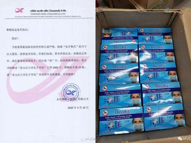 2020年4月10日,正值泰国宋干节来临之际,永星钢铁(泰国)有限公司为皇太后大学孔子学院送来了宋干节的“特殊礼物”——慰问信以及防疫口罩2000只、酒精洗手液10瓶,同处异国他乡,携手共度难关。