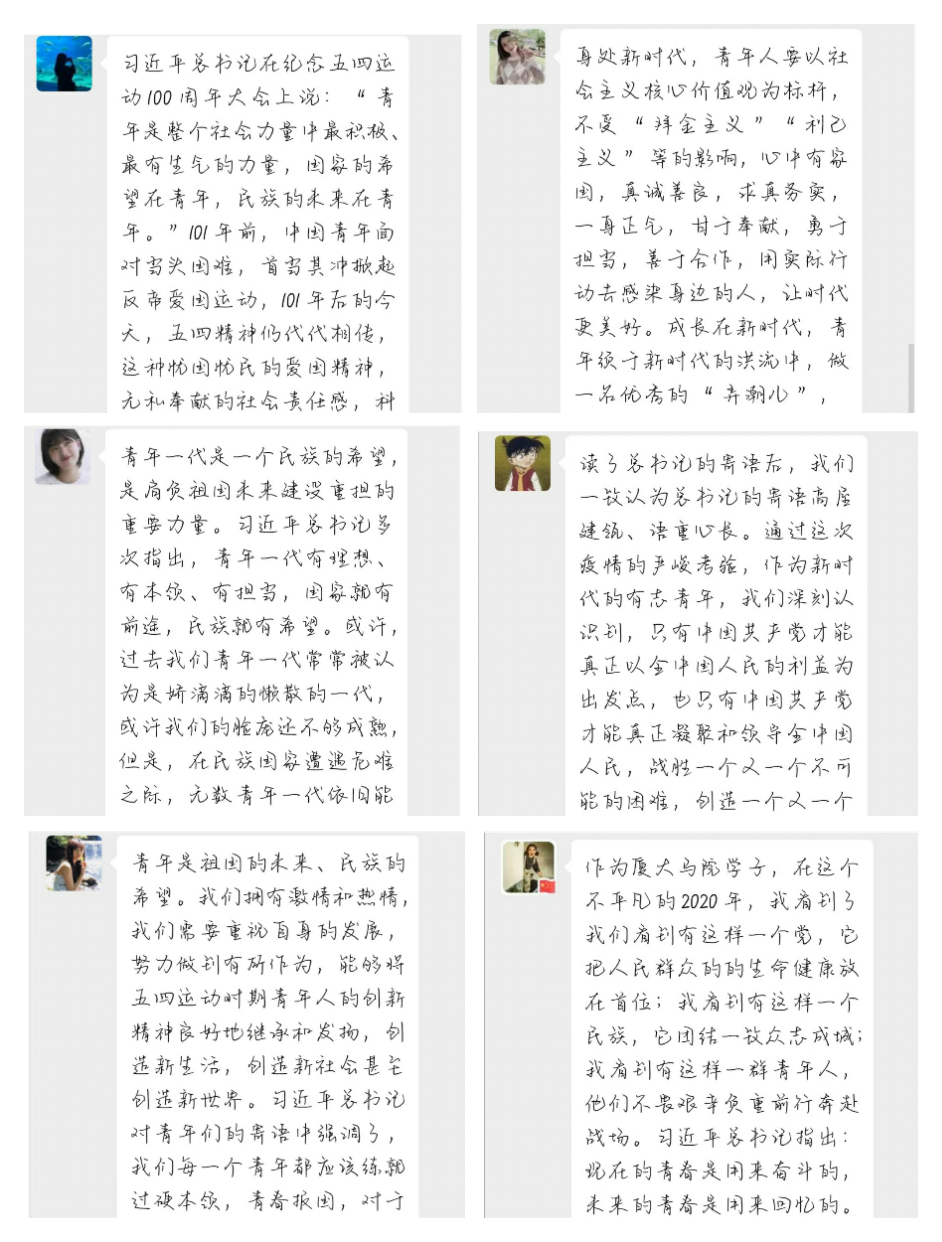此外,五四青年节当天,学院除了组织全体青年团员观看了厦门大学纪念五四运动101周年表彰大会暨先进青年事迹分享会的线上直播之外,还组织院研究生会围绕着“绽放战疫青春,传承五四精神”这一主题开展了系列活动,包括“全国一盘棋——彰显国家制度优势”微信推文、展出“传承五四精神,共抗疫情、爱国力行”主题作品集、推出“绽放战役青春,五四传承有我”青年战役事迹分享、宣传团中央五四专题宣传文章等。通着这些活动,进一步教育了学院青年要传承五四精神,树立青年责任意识,扛起青年担当,履行青年使命。