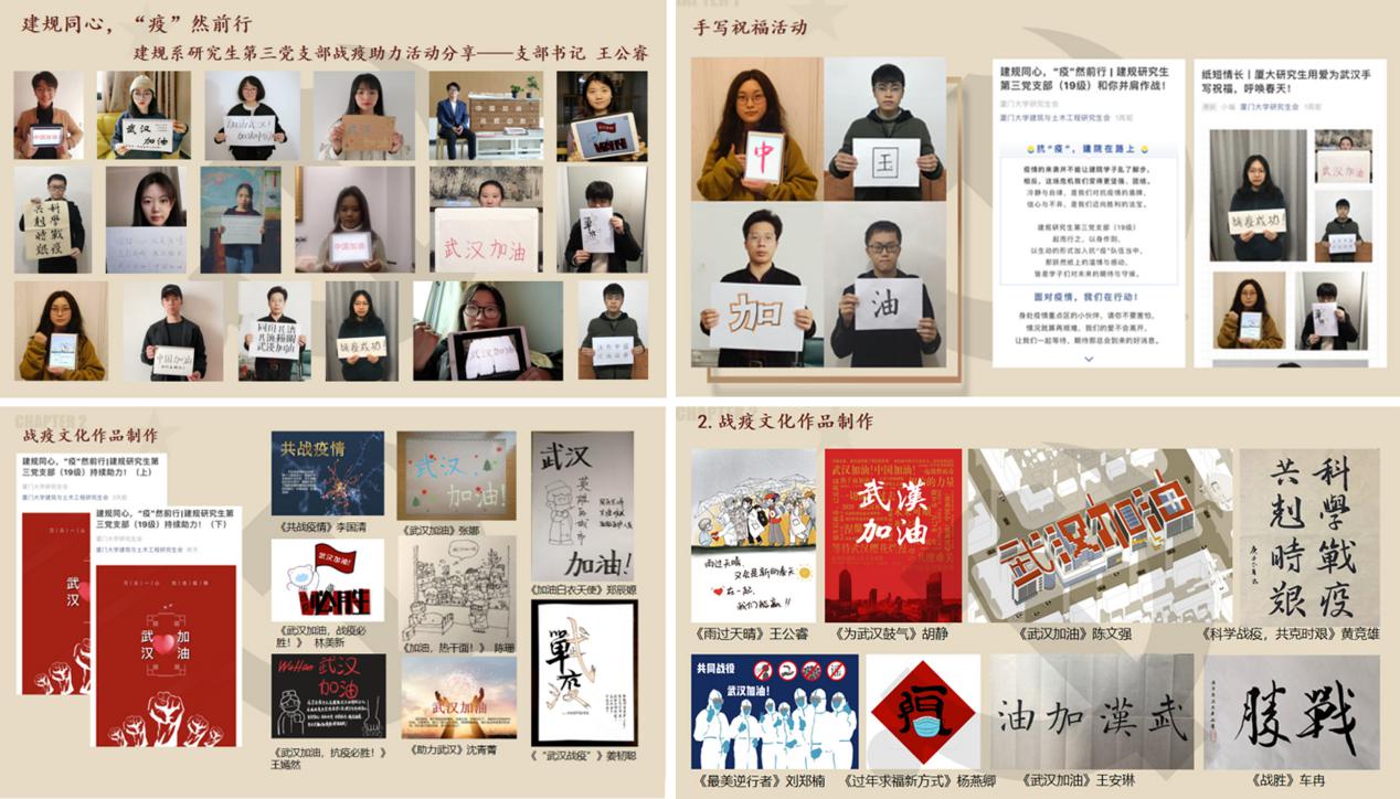 各党支部在带领党员科学防疫、保护好自身的同时,不断增强党员责任意识,号召党员奉献爱心、爱国力行。一是当好战疫前线“先锋队”。各学生党支部立足城乡社区实际及学校防疫工作需要,落实党员“双报到”机制,因地制宜、谋势而动成立51支党员“先锋队”“突击队”和“志愿服务队”,305名学生党员冲在前、战疫情。二是当好战疫加油“啦啦队”。各党支部积极参与“共抗疫情 爱国力行”网络文化作品征集活动,以笔为戎,以“艺”战疫,为奋战在“疫”线的战士加油助威,增强必胜信心。艺术学院2017、2018级本科生党支部,医学院翔安医院研究生党支部,经济学院统计系2019级硕士生党支部,建筑与土木工程学院建筑系与城市规划系研究生第三党支部等向党员发起倡议,手写祝福语、拍摄加油视频、创作诗歌、书画作品等,为医护人员和武汉人民送去祝福,传播正能量。三是当好战疫支持“后援队”。各党支部积极响应学校“守望相助 共克时艰”募捐倡议,做到学生党员全覆盖捐款。管理学院“共克时艰”临时党支部在疫情发生后第一时间通过多种渠道筹措物资,累计募集796490余元,向湖北支援口罩、防护服、护目镜、医用手套等61000余件。医学院研究生党员姜楠、于胜男等同学为疫区募集善款83232元,多渠道采购临床适用标准口罩8288个,第一时间发往湖北一线医院。党员还积极参与“战疫无忧云辅导”志愿活动,为医护人员子女提供学业辅导、心理疏导、防疫科普等线上“多对一”服务,解决“最美逆行者”的后顾之忧。