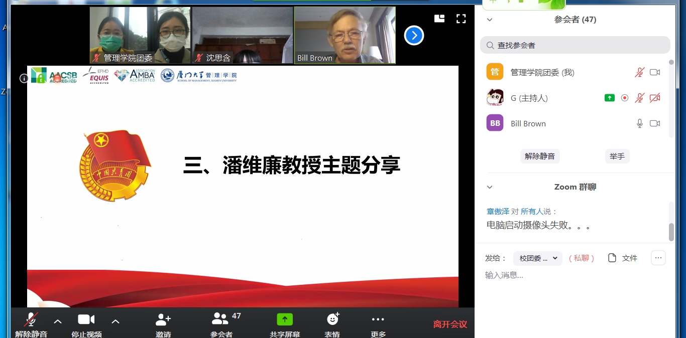 3月30日15:00,2017级本科生会计三班、四班团支部联合举办的“老潘说战‘疫’——青年大学生从中美应对新冠肺炎疫情中能学到什么”主题微团课在线上召开。管理学院外籍教授潘维廉应邀作客团课直播间,通过海外看战“疫”,结合所在国应对疫情情况,讲述对中国战胜疫情的信心、对世界的贡献。校团委书记曾铮,院团委书记江娇、组织员吴光锡、辅导员揭上锋、高瑜聪出席活动,2017级本科生会计三班、四班团支部全体团员参加团课学习。