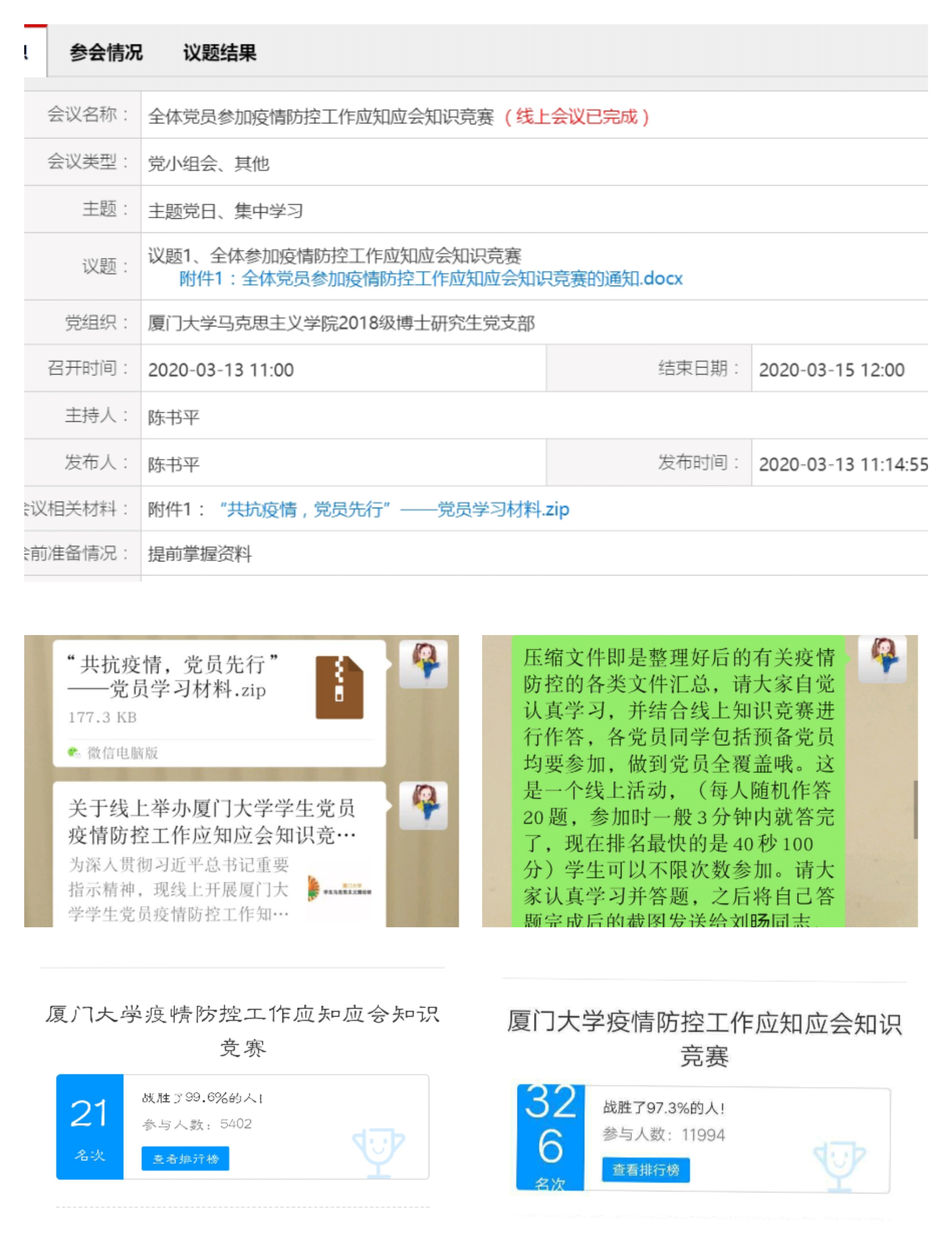为深入贯彻落实中央和校党委的要求,创新党支部工作模式,加强基层党组织建设,3月以来,全院学生党支部结合学校下发的有关抗击疫情的文件、视频等资料,组织开展了线上“学生党员疫情防控工作应知应会知识竞赛”。党员同志们在自觉主动参与知识竞答的基础上,不仅理论知识收获颇丰,而且极大地鼓舞了党员同志们充分发挥先锋模范作用的意识。