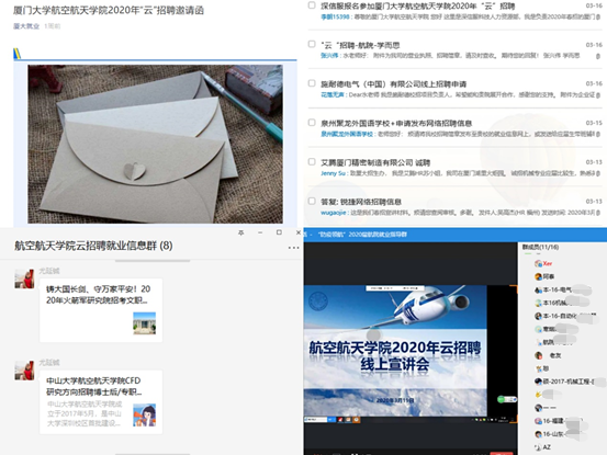 学院向用人单位发布“厦门大学航空航天学院2020年云招聘邀请函”,邀请用人单位开展 “云”招聘,目前已有数十家单位主动联系学院开展招聘工作。学院专任教师、校友协同推进,积极联系推荐就业机会,向合作单位重点推荐优秀毕业生。