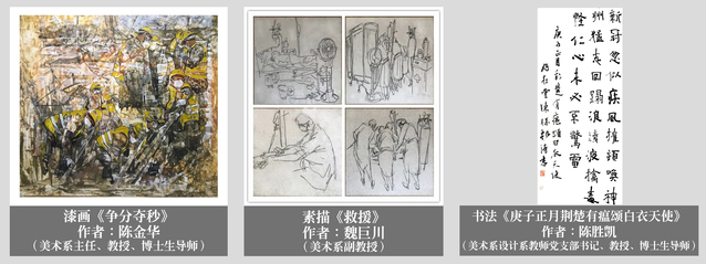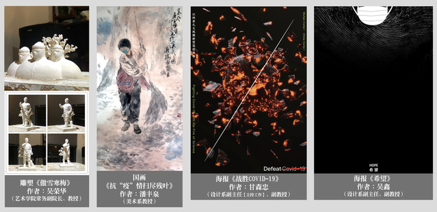 艺术学院常务副院长吴荣华教授再创雕塑作品《傲雪寒梅》将一线的医护人员比作傲雪中坚挺的寒梅,绽放在平凡的岗位上,迎接春天的到来,正是“俏也不争春,只把春来报”。 美术系潘丰泉的国画《抗“疫”情扫尽残叶》(原名《晨风》),用基层环卫工人的形象,致敬基层工作人员在疫情期间的辛勤劳动,也希望借清扫之喻意,将疫情早日“扫除”干净。设计系甘森忠的海报《战胜Covid-19》,犹如火神一出,希望战胜病毒的科学之火、信心之火、团结之火越烧越旺,将病毒燃烧消灭殆尽,从而最终取得抗疫胜利。设计系吴鑫创作的海报《希望》,象征着在黑暗中,坚守一线全力救护的医护人员的白色口罩如太阳般照耀着大地,带给人们希望和光明。