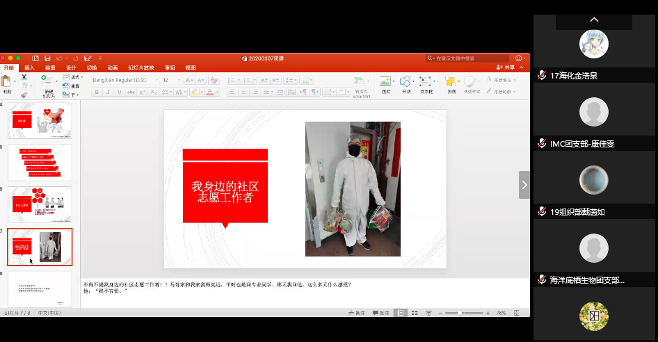 研究生物理海洋二班团支书马啸聪来自新疆乌鲁木齐,他和大家分享了这个寒假的战“疫”故事。他始终牢记党员身份,第一时间主动到社区报到,帮助居民解决实际生活困难。他说,“身着防护服,为居民倒垃圾、送菜的那些日子里,我收到了无数发自肺腑的感谢,每次都觉得很温暖,我们隔离的是病毒,但爱从未被隔离。”他还说,在工作中认识了很多社区工作人员,他们或在寒风中值守夜班,或三过家门而不入,有的人一离家就是十多天,他们中有党员,也有普通群众,都值得被尊敬、赞扬和学习。同样参与社区防疫工作的2019级本科1班团支书陈蓓涵也结合自身经历进行了分享,主题是“担当与爱”。她认为,作为团员青年,应当强化身份意识,明确责任担当,这是一次大战,也是一场大考,作为社会主义建设者和接班人,我们一定要经受得住考验。同时,她真诚地呼吁大家向辛勤奋战在各行各业的抗“疫”一线工作人员致谢致敬。她说,这是爱的传递,同时也是正能量的接力。