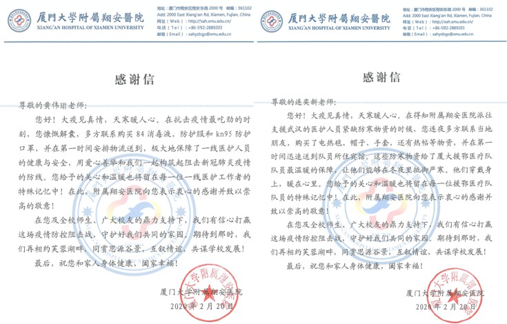 温暖来自携手共进的坚韧,两封来自厦门大学附属翔安医院的感谢信,让我们知晓身边辛勤工作努力学习的师生,原来有许多人在这场战“疫”中默默付出。一场突如其来的寒潮,让来自温暖闽南的厦大附属翔安医院驰援湖北医护工作者辗转反侧、难以入睡,他们的身体状况,牵动着厦大人的心。得知情况,醇醚酯化工清洁生产国家工程实验室的连奕新老师立即联系正在湖北当地的学生余某,余同学的母亲立即多方筹措,捐赠了电热毯、帽子、手套、热帖等保暖物资,并马上安排物流送至厦大附属翔安医院驰援湖北的医护工作者手中。在防护物资紧缺的特殊时期,在学院办公室秘书黄伟珺老师多方协调联系下,化学系99级院友王平将一批消毒液、防护服、口罩等防护用品,捐赠给厦门大学附属翔安医院一线医护人员,让他们在抗击疫情的同时得到更多更完备的保护。同时,王平院友还利用自己的创业项目为一线新建医院保障了清洁安全的环境。