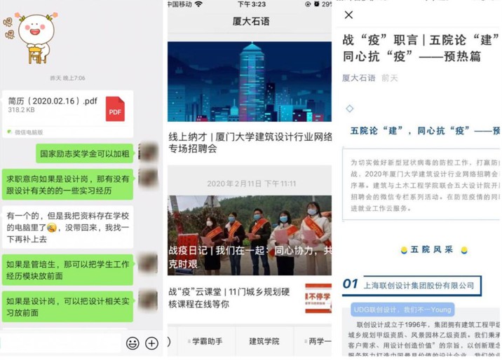 此次空中招聘包括求职岗位发布、企业特色宣传,毕业校友访谈,简历面试辅导等环节。自2月10日厦门大学建筑设计行业网络专场招聘会信息发布以来,已经陆续推出战“疫”职言毕业校友访谈专栏3期,“战‘疫’职言,五院论‘建’企业网络招聘宣讲专栏6期。其中,企业专栏邀请五所设计院就空中招聘流程及注意事项、招聘岗位的具体情况、对于简历的建议等方面进行专题分享。校友访谈专栏邀请不同专业的毕业生分享求职经历、提出简历制作与面试过程的经验辅导,并建立学长学姐空中“职”约微信群为求职学生进行答疑。