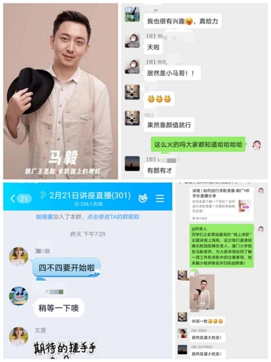 2月21日晚,腾讯校园招聘负责人、厦门大学校友马毅学长受邀作客管理学院“海韵涛声”系列讲座之线上求职指导直播间分享“如何进行求职准备”。当“大咖”遇上“直播”、在线就能直接互动对话——来自全校16个学院的200余名厦大学子纷纷上线围观,迫不及待向学长讨要一份“求职准备经”。