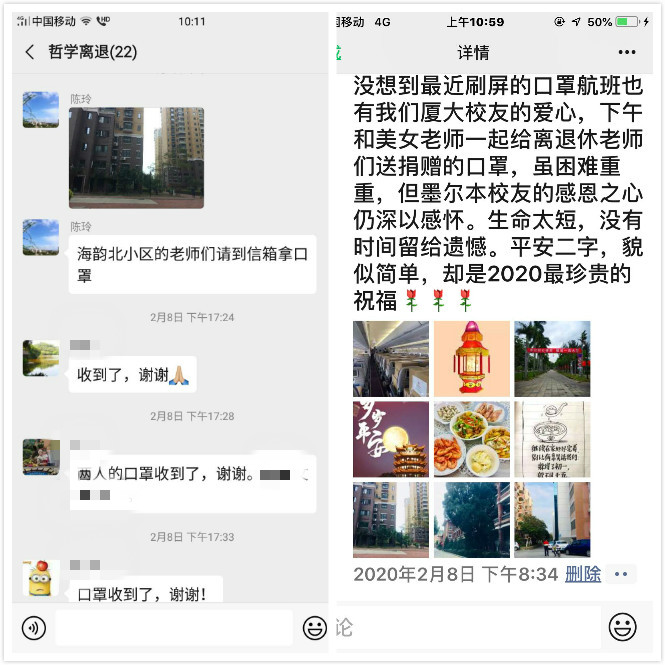 2月8日元宵节当天,在墨尔本校友的物资支持下,学校为在厦的离退休老师发放口罩。正值疫情期间,出行不便,但是各系在职教工党支部书记、党员、工会小组长都积极行动,一个下午,6位老师分三组分别辗转几十户人家,为退休教工老师送口罩上门,送上关心与问候。哲学系教工党员、工会小组长陈玲老师在朋友圈分享道:“没想到最近刷屏的口罩航班也有我们厦大校友的爱心,下午和美女老师一起给离退休老师送捐赠的口罩,虽困难重重,但墨尔本校友的感恩之心仍深以感怀。”