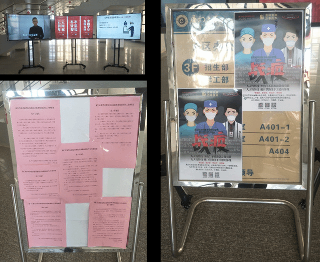 抓宣传。疫情发生后,学院迅速组织抗疫宣传小组做好院内疫情防控宣传工作,着力打造疫情防控宣传阵地:线下利用学院一楼三块显示屏全天候滚动播放疫情防控宣传视频和有关图文资料,专设展示栏及时张贴上级政府部门有关通知和公告;线上利用微信、QQ工作群等在全院范围内发起“自觉提高防范意识、做好防护工作”的倡议,及时推送各类防护知识, 做好各类教职员工心理疏导等工作,真正实现线上线下宣传合力,以此确保上级各项有关新冠肺炎疫情防控工作指示精神传达到位、疫情防控各项宣传工作落实落细。