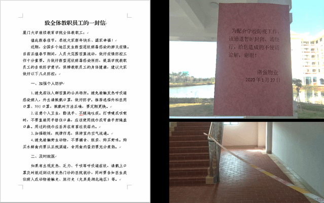 春节前夕,一封致全体继续教育学院教职员工的信通过网络“寄”到了大家手里,“讲卫生、强防护,多锻炼、少聚集。”这封信,带给全体继续教育学院的教职员工们的不仅仅是一份新春佳节的问候,更是一份关于疫情防控的温馨提醒。与此同时,一条条警戒线也在这个春节在翔安继续教育学院大楼内逐一拉起,每一条警戒线、每一扇关闭的通道门就像是一道道防护墙,将大家安全和健康保护好,将骇人的病毒和危险隔离在外。