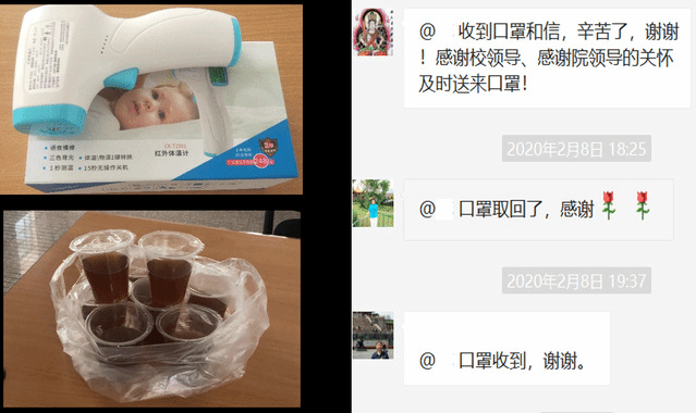 做好物资准备工作。例如:为寒假执行紧急任务的教职员工提供口罩;做好物资准备,目前院内公共区域的消毒液、消毒洗手液、酒精消毒液、体温枪等已陆续到位;加大对离退休教职工的关怀力度,请专人逐一上门派送口罩等防护装备;多方协调、积极争取,做好学院寒假值班人员抗病毒中医保健茶发放工作。