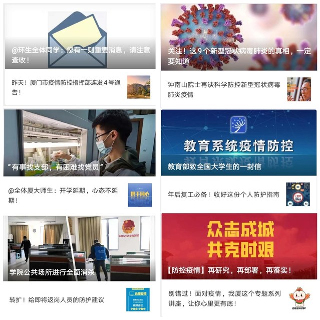 迅速传达各项精神、政策和信息。通过学院网站、微信公众号、电子显示屏、邮件、微信群、QQ群等多种途径和形式将上级和学院的各项精神、政策、知识、信息等传达到每位师生,确保“人人知晓,个个知情”。一段时间以来,“厦门大学环境与生态学院”“环生时代”“厦大环生研会”三个学院微信公众号累计推送相关文章60篇(次);学院网站开设“防控疫情”专栏,及时刊发相关文章。