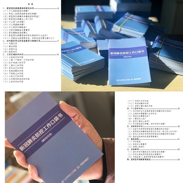 “口袋书”由学生工作部教育科编印,分批送往各学院辅导员手中,保障人手一册,满足需要。“当前网上信息目不暇接,各类防护知识铺天盖地,‘口袋书’内容精准、方便携带,还有暖心的辅导员专属防护知识,有助于我们有针对性、高效率地开展工作,真是一本疫情防控的‘工具书’‘明白书’和‘方便书’”,辅导员杨盛澜读后深有感触。