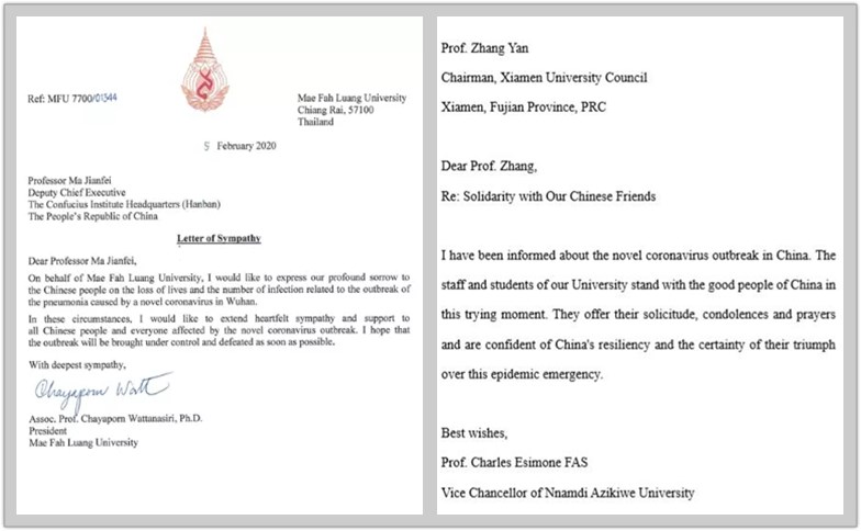 泰国皇太后大学校长猜也鹏(Chayaporn Wattanasiri)表示,在此艰难时期,我们希望疫情可以得到很好的控制。同时,我们也向因新型冠状病毒而失去生命的人们表达最诚挚的哀悼。尼日利亚纳姆迪•阿奇克韦大学校长查尔斯•埃西莫内(Charles Esimone)在给我校党委书记张彦的信中表达了慰问和祝愿,他表示纳姆迪•阿奇克韦大学全体师生将始终与厦门大学师生站在一起,坚信中国人民一定能够打赢这场疫情阻击战。
