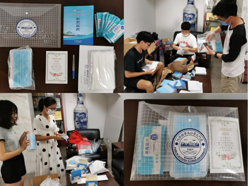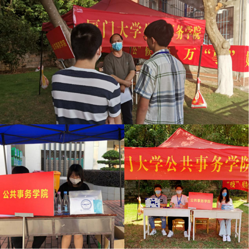5月16日早上七点,接站工作开启,负责接站的是学院学生工作组全体成员和志愿者。学院党委副书记林盛铨、刘钟南,团委书记徐莹,团委副书记蒋慧琼,党务秘书谭超五位老师,分别带领校内机动组、T3航站楼、厦门北站、T4航站楼、厦门站的志愿者小组进行校内外对接工作,一起给即将返校的公事学子带去暖心问候,极大彰显了公共事务学院的人文关怀。早上八点多,各校内志愿者们也紧随其后早早地就在芙蓉和海韵宿舍楼下做好了迎接同学们返校的准备,写着“‘公’候君来,万‘事’如意”的横幅与码得整整齐齐的“健康大礼包”让久违校园的同学们倍感亲切,志愿者温暖的叮嘱与问候更是让返校同学深受感动,眉眼里都藏着笑意。