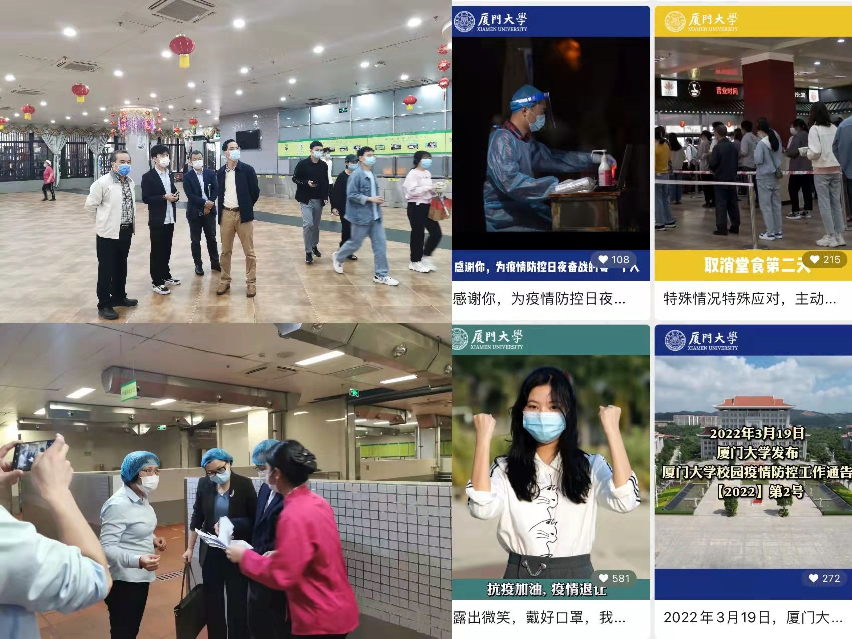 学校纪检监察部门组建厦门大学疫情防控工作监督检查组工作专班,成立5个监督检查小组,深入学校各校门、食堂、宿舍、超市、快递点等关键部位检查疫情防控工作落实情况,3月15日以来共开展专项检查10余次,发现和收集学校疫情防控工作相关问题18个,推动问题及时在一线整改。宣传部/教师工作部主动靠前主动策划,充分利用校园媒体平台做好防疫抗疫主题宣传,及时准确发布疫情防控的权威消息和最新动态,全媒体联动挖掘展示我校师生在抗击疫情的精神风貌,3月14日以来,学校新闻主页发布6篇疫情相关稿件;校报编辑部刊发抗疫专版;对接主流媒体发稿10余篇;官方微信、微博、抖音、b站等新媒体平台共发稿39篇(条),总阅读/播放量近200万,硬通知与软提醒相结合,引导师生做好个人防护,做好疫情防控正面宣传。教师工作部、校工会第一时间联合向全体教职工发布《携手战“疫” 温暖同行——致厦门大学全体教职员工的倡议书》,同时积极做好疫情期间的思想引领工作,强化健康知识传播。离退休处坚持将老同志生命安全和身心健康放在首位,组织各单位全面掌握老同志情况,做好关心帮扶,发布致全体离退休教职工的一封倡议书,号召老同志坚定必胜信念、服从组织安排,强化自我防护、积极传播正能量。国际处推送中英文版《致厦门大学外籍教职工的一封信》,向外籍教师传达学校各项疫情防控要求和政策,同时在外籍教师工作群中及时转发国家和地方疫情防控信息,及时答疑解惑。