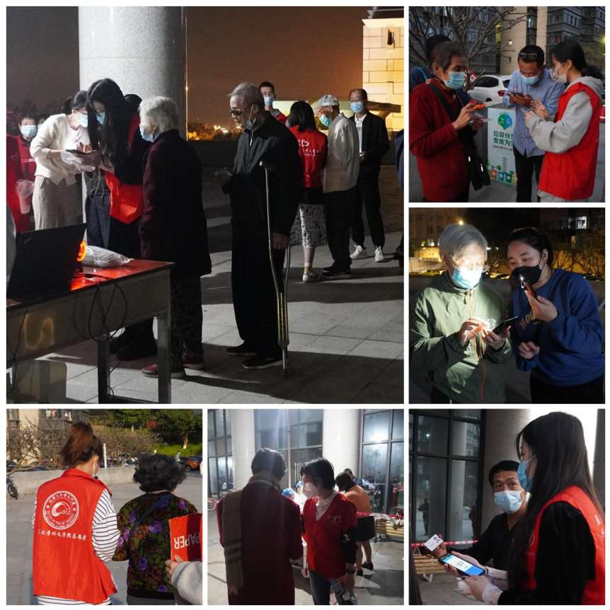从下午4点启动工作,直至晚上9点半夜色深沉之时,20位外文师生志愿者与医务组等现场工作人员齐心协力、全心投入,坚守岗位连续工作,共完成核酸检测1640人次。