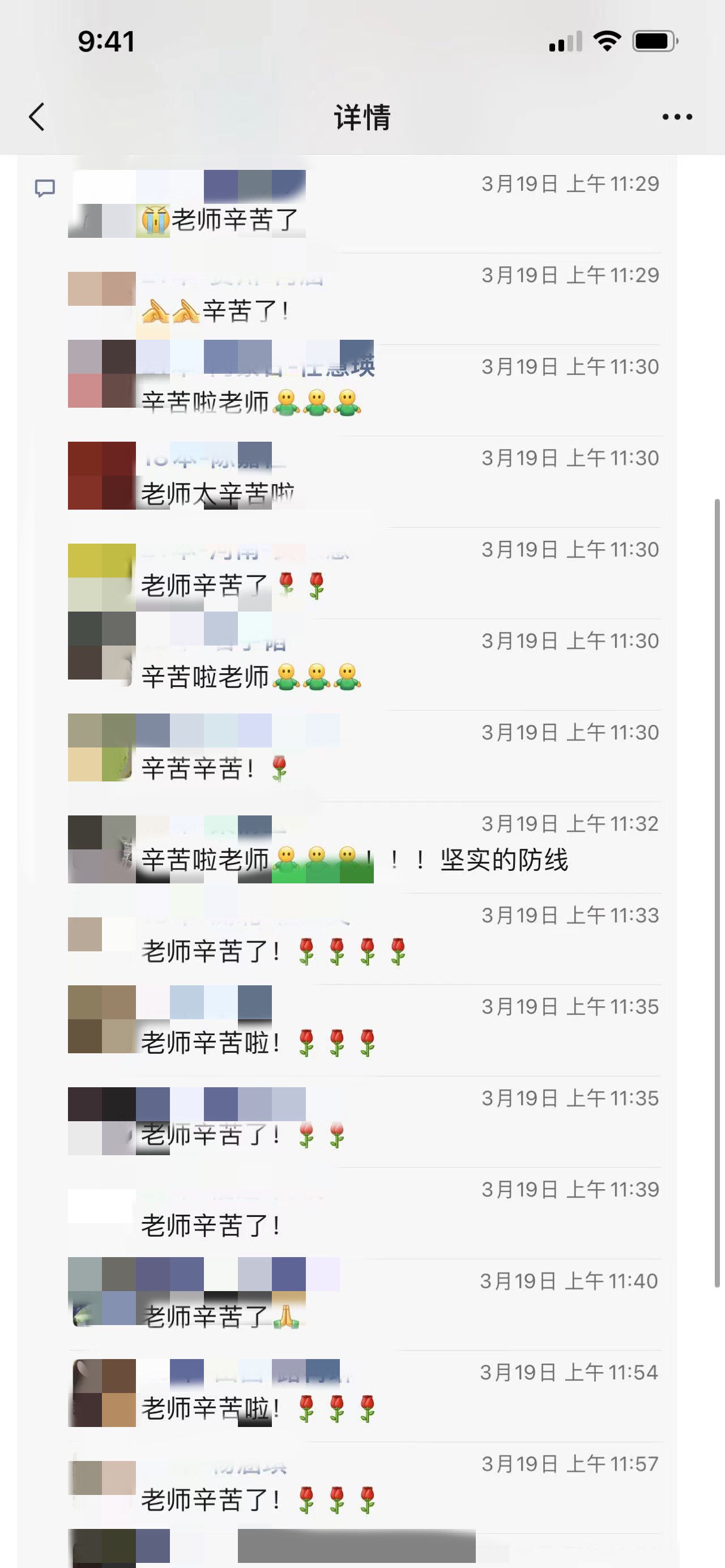 老师,辛苦了!“老师辛苦啦!老师注意休息!”同学们纷纷在老师朋友圈和微信群内留下感人话语。“我的厦大我守护!”志愿者招募刚刚发布,学生们应者云集,一呼百应、迅速集结。不到一天的时间,就有34名同学踊跃报名,目前这批队员已投身到此次抗击疫情的多个岗位。同学们说,这几天,常说的话是老师辛苦了!但或许老师们也想说,这场风雨同舟的双向奔赴比窗外明媚的春光还要浪漫。