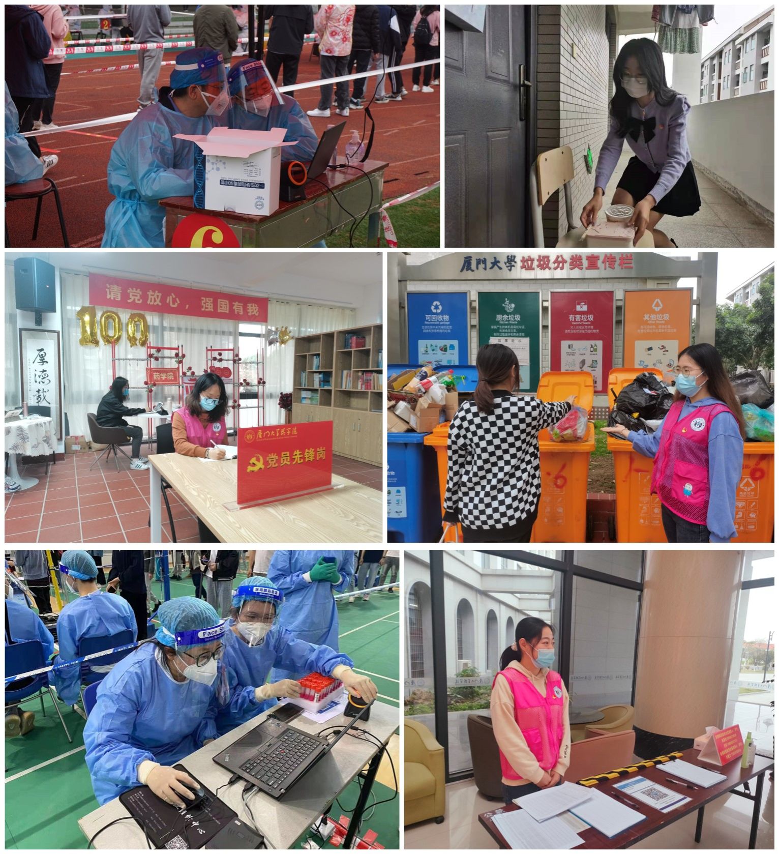 学院的老师和同学们也积极投入到疫情防控志愿服务一线:学院教师主动在海韵学生公寓核酸检测点协助核酸检测有序进行;本科生党支部迅速行动,组成爱心送餐队,为部分居家健康观察的同学购买生活用品、提供送餐服务;在学生宿舍园区“一站式”共享平台设立党员先锋岗,安排党员和入党积极分子值班值守;同时,同学们也积极主动参加翔安校区核酸检测、食堂防疫等志愿项目,助力校园疫情防控。