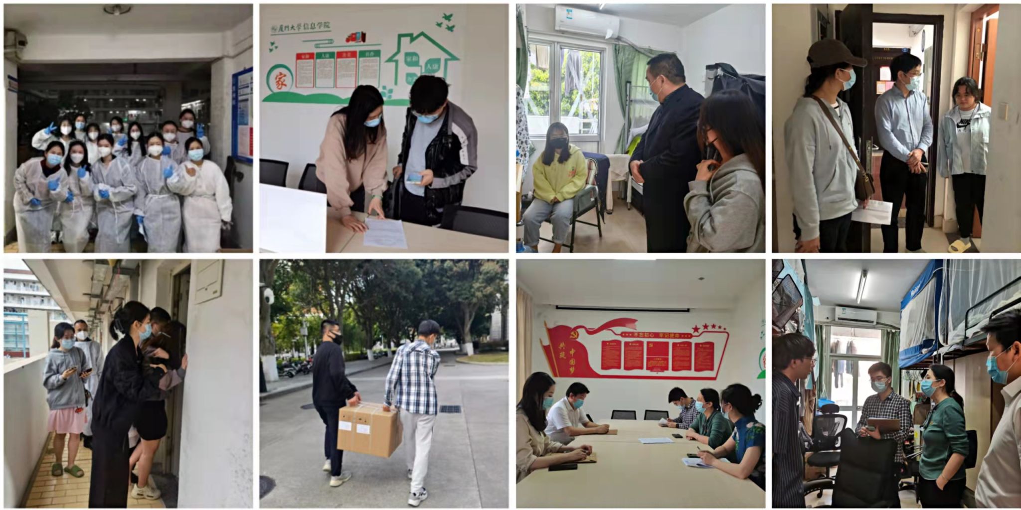 学院领导、教工党支部书记、各工会小组深入退休教职工群体,关心慰问老同志;学院重启海韵7-124学生事务服务点,学工组、院办、学生骨干等轮值驻守,满足学生审批、用印、提交材料等行政事务需要;学工组成立防控应急专班,第一时间分校区全员入驻学生宿舍园区,下宿舍、走楼栋,及时传达防疫要求,了解学生思想动向,关心学生需求,帮助解决实际困难,深夜送突发脚伤的学生就医,参与宿舍园区的核酸检测秩序维护、逐层逐户逐个排查核实学生信息;全面实行线上教学,网络课堂秩序良好,及时协调空宿舍为学生提供参与研究生线上复试的场地与空间;研究生导师、本科班主任第一时间主动联系学生,关心、了解、掌握、跟踪学生在宿舍的学习与科研情况,通过视频会议、电话微信等方式及时与学生交流、沟通,稳步推进学习进度;办公室值班老师帮助毕业班学生重启实验室电脑、调试远程连线,服务学生学习科研亟需。