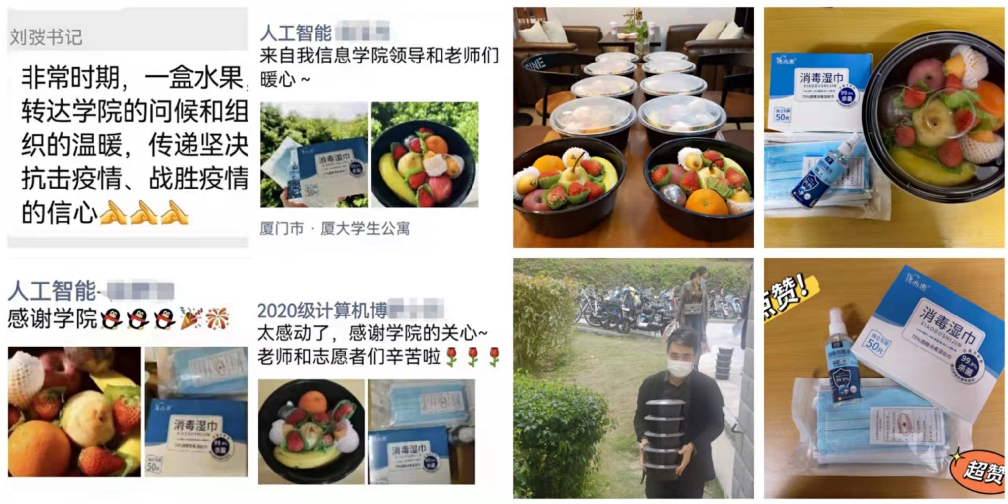 “非常时期,一盒水果,传达学院的问候和组织的温暖,传递坚决抗击疫情、战胜疫情的信心!”学院时刻把师生的健康安全放在第一位,党政领导、导师、辅导员、后勤工作组等各方力量,第一时间开展服务保障,主动对接、嘘寒问暖,贴心为大家送上防疫物品和水果,“谢谢老师们的关心,太赞了!”“老师和志愿者们辛苦啦!”师生满怀感动,纷纷表达感谢,防疫充满“暖意”!