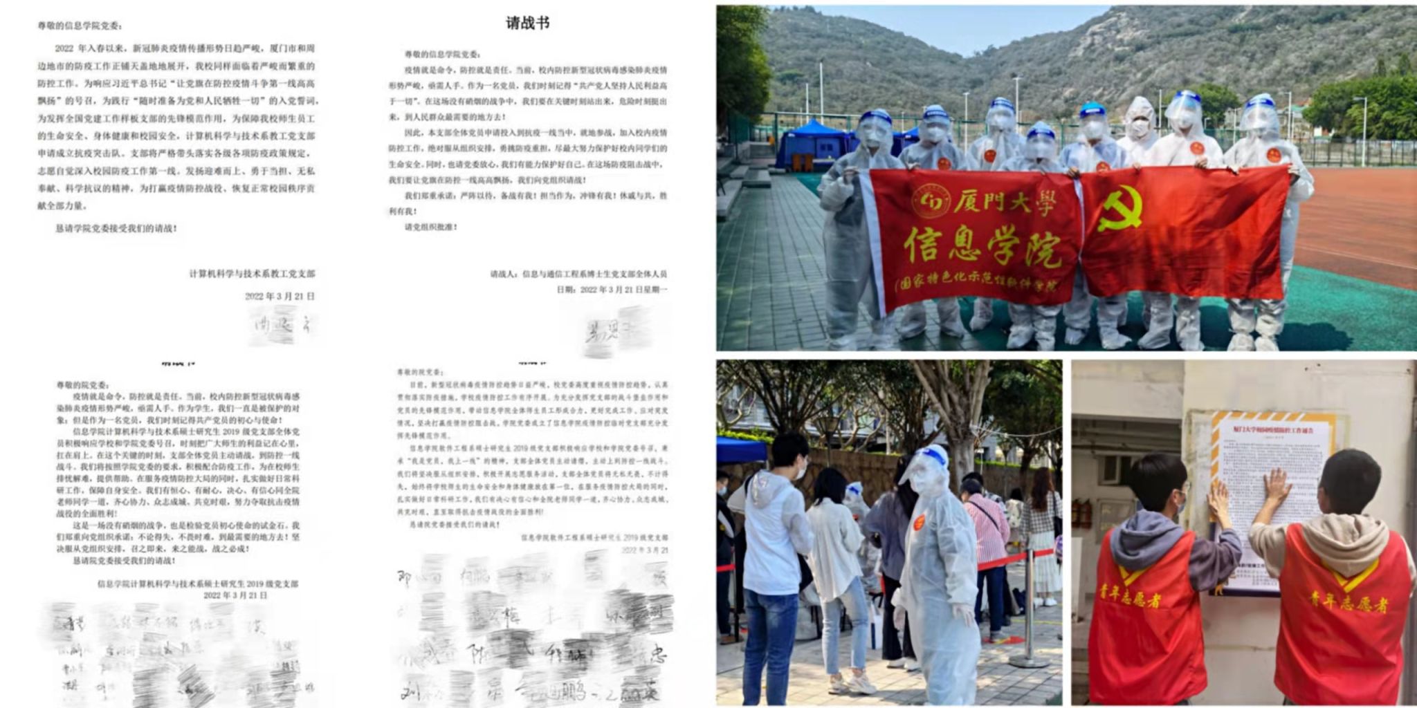 学院党委充分考虑到跨校区办学实际和工作需要,第一时间组建成立信息学院疫情防控临时党支部和“强信先锋”临时党支部,分别由学院思明校区和翔安校区的师生党支部书记、学生工作组成员及部分师生党员、“强信工程”大学生骨干培训班一期学员中的党员组成。
