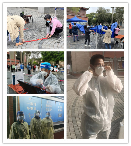 师生齐心共抗疫,志愿服务显担当。为配合学校开展全员核酸检测,我院教工党员冲锋在前,积极参与志愿服务工作,协助医护人员开展校内全员核酸检测。志愿者们布置核酸检测点、在现场维护秩序、协助医护人员登记扫码……忙碌的身影是志愿者与医护人员为跑赢疫情、守护校园的最美模样。学生党团员也“疫”呼百应,积极参与疫情防控志愿服务,组建了一支党、团员抗疫先锋队,筑起一道坚实的“青春防线”。