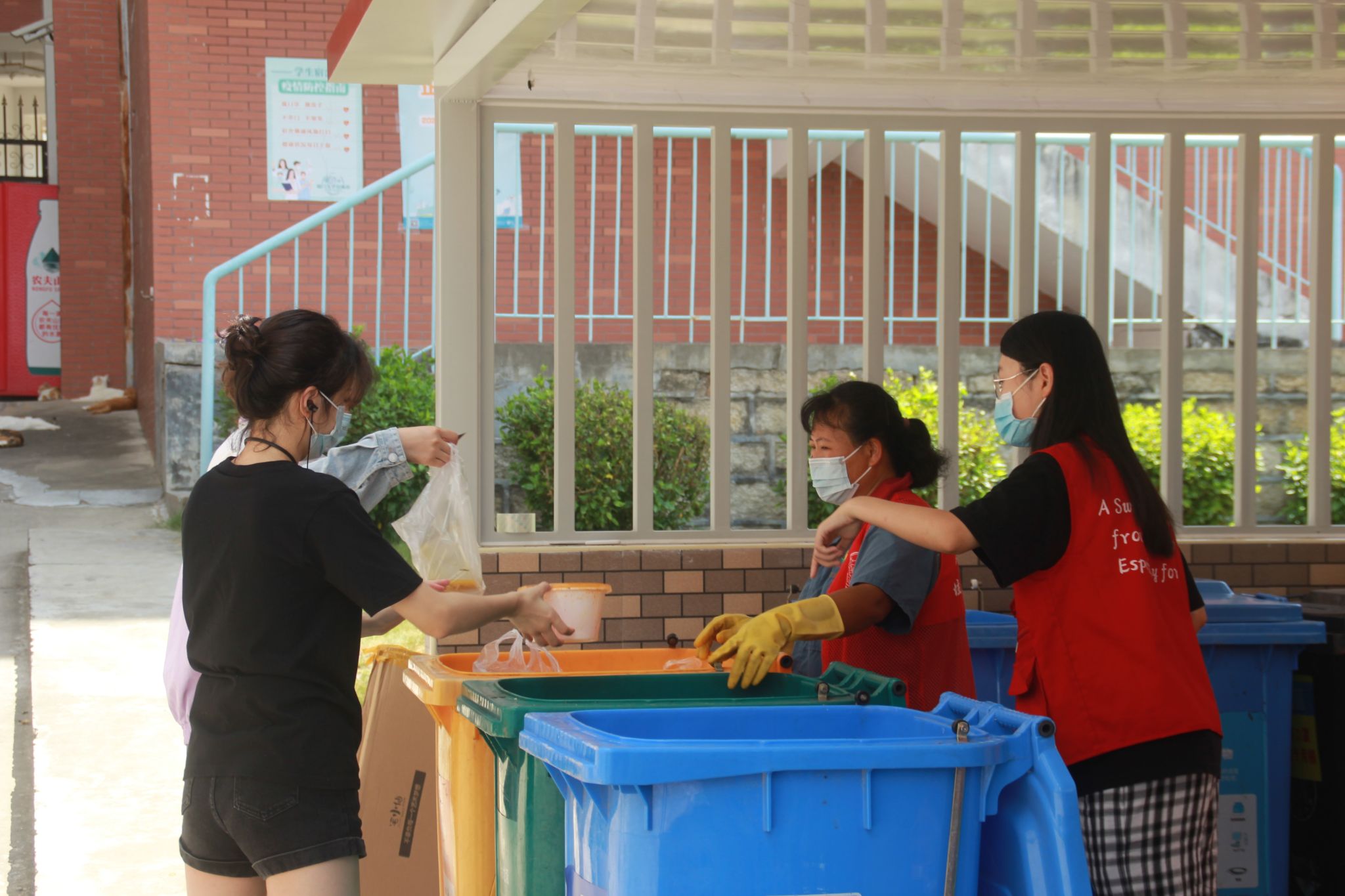 “请把废弃口罩扔进‘其他垃圾’桶,一定‘罩’顾好自己呀!”垃圾分类工作事关环境整洁,在疫情防控期间更是减少病毒传播的重要环节。自学校实行闭环管理、取消堂食以来,生活垃圾明显增多,为保障良好的环境卫生,青年志愿者们争当垃圾分类守护者,与后勤环卫工作者一起,参与垃圾分类督导工作,对口罩、食物、快递包装盒等分类进行严格把关。
