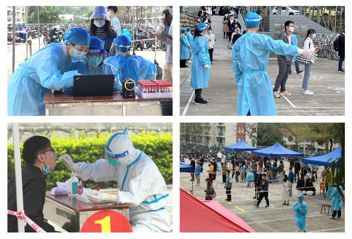 3月30日上午,教工党员志愿者提前到达海韵学生公寓核酸检测现场,协助检测人员申报条形码、录入个人信息、引导检测人流、维护现场秩序、快速疏散人员,用细心与耐心践行初心,答好疫情防控考卷,在战疫一线上竖起党员旗帜。经过5个小时工作,志愿者齐心协力完成当天上午四千余人次的核酸检测任务。