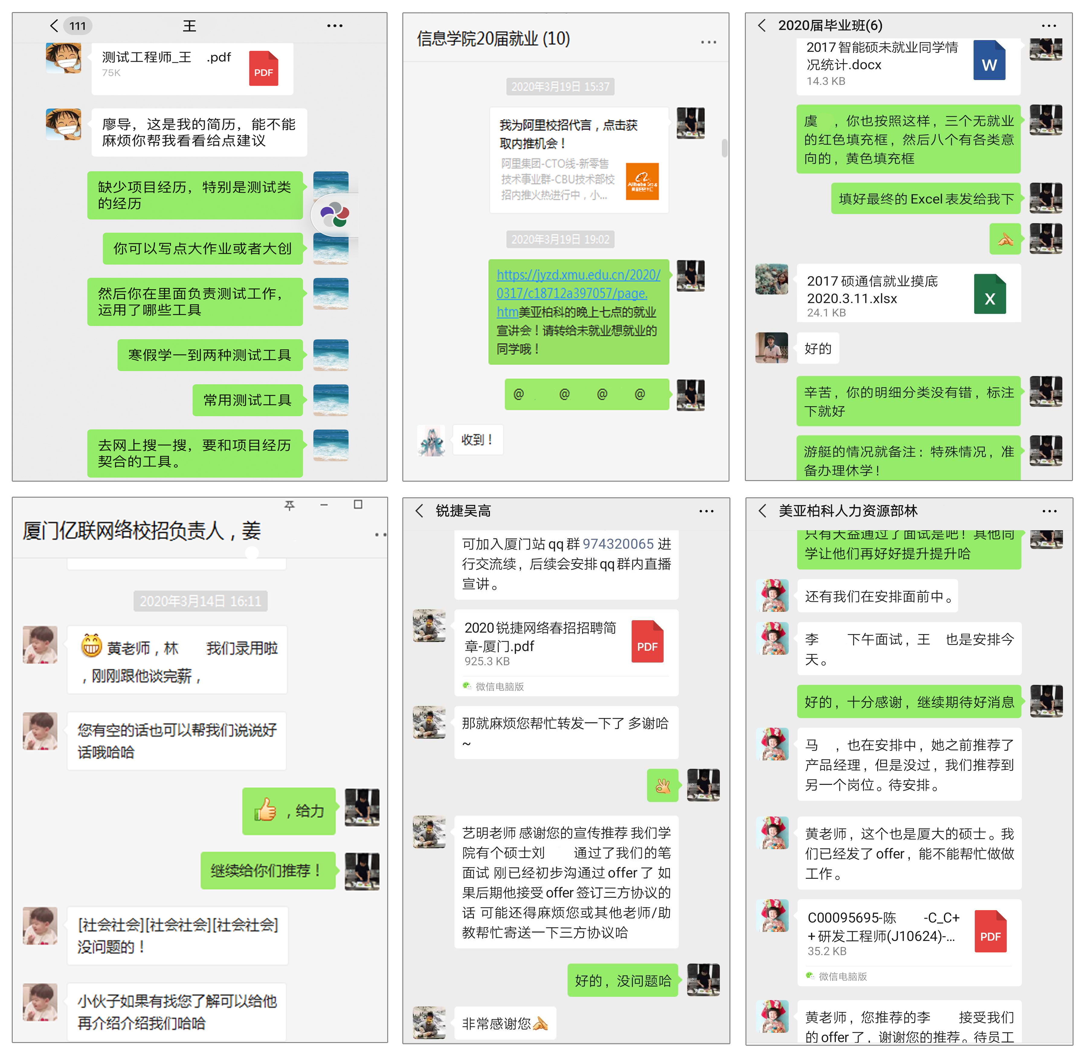 “特殊时期,能推荐一个是一个,任何一个面试机会都弥足珍贵”,辅导员黄艺明老师是这么说,也是这么做的。疫情以来,他根据学生需求,主动联系企业,先后帮助多个同学在厦门市美亚柏科信息股份有限公司、厦门市亿联网络技术股份有限公司、锐捷网络股份有限公司拿到了宝贵的offer。