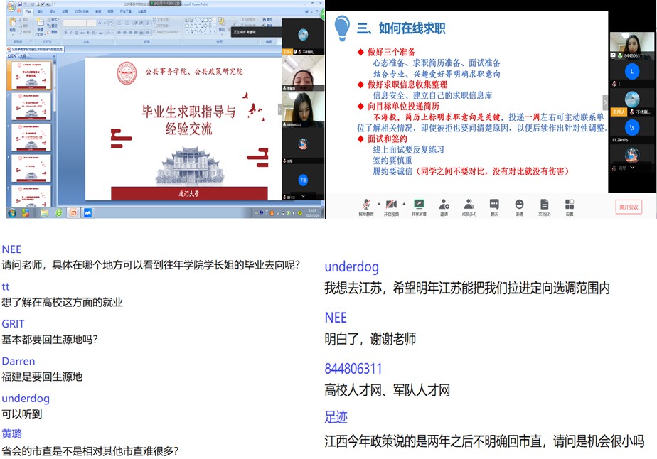 就业服务既要优先服务应届毕业生,也要前瞻性覆盖到非应届学生群体。对此,学院分门别类、重点分明地对学生进行线上就业指导。3月24日,学院邀请厦门大学学生就业创业指导中心的占群丽老师为学生作线上指导,同时院党委副书记刘钟南老师、研究生辅导员、高级职业指导师蒋慧琼老师也加入指导,来自学院及其他兄弟学院近百名学生参加了本次线上交流。针对同学们关切的问题,老师们一一作出解答,并给予了积极的建议和指导。针对应届毕业生,学院重点围绕疫情期间的就业形势、就业政策作详细分析,重视毕业生简历制作、面试等求职技巧的指导,提高毕业生的硬核求职技能;同时结合本院的专业特色,为非应届学生重点分享国考省考和基层选调的相关内容,引导同学们尽早做好职业规划。