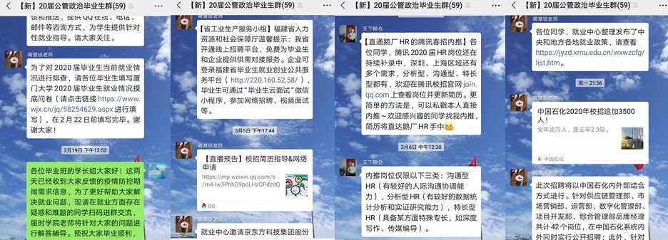 摸清毕业生的就业心态、就业难题和就业服务需求之后,学院辅导员及时对部分毕业生进行“一对一”心理疏导,针对性帮助同学们迈过心里那道“坎”,化解同学们的焦虑情绪,帮助其树立起正确的求职心态,引导其积极主动走向线上招聘。与此同时,学院协助用人单位线上宣传和对口推荐,直接拉近毕业生与用人单位的距离,打造求职直通车;此外,通过毕业生微信群、“厦大公事”官方微信等媒体平台及时共享学校就业指导直播课,分析相关就业政策信息,转发传递用人单位宣讲、岗位招聘等信息。通过搭桥牵线,减少就业信息不对称造成的不良影响,扭转毕业生求职的被动局面。