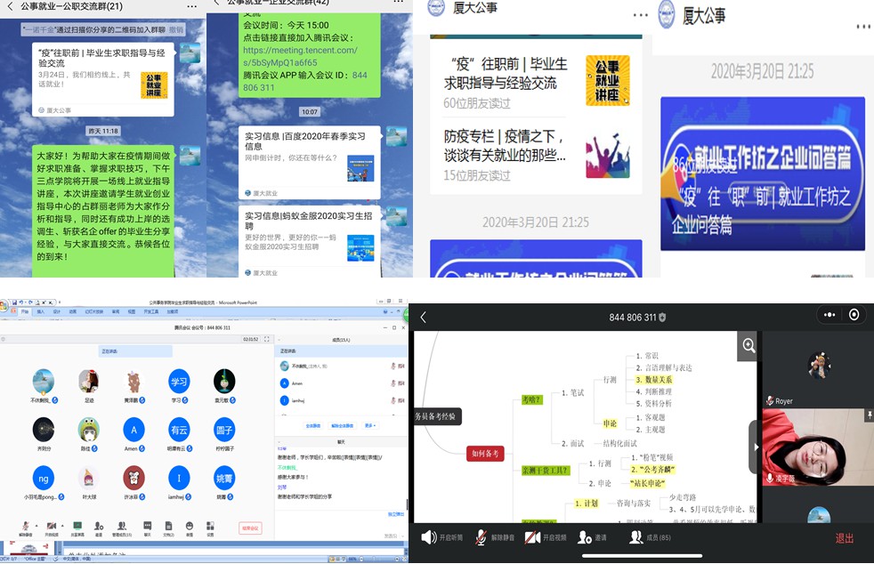 为进一步引导非应届学生提前做好职业规划,学院结合同学们的就业期待,建立“企业交流群”、“公职交流群”两大不同就业方向的微信群,加大就业政策、实习信息的收集力度,对信息进行分类并发送到对应的交流群,帮助同学们精准获取信息,为同学们提供更加直观、针对性更强的实习岗位。与此同时,以高年级带动低年级,建立“先进传帮”机制。3月初,学院筛选出一批求职成功的优秀毕业生,其中有取得腾讯、新东方、深信服科技等知名企业offer的,也有成功“登岸”江西选调及其他事业单位的,邀请这些不同行业领域的毕业生分享求职经验和心路历程,不定期在“厦大公事”公众号推送经验贴。此外还通过腾讯会议平台连线优秀毕业生,与非应届学生直接进行经验传授和互动交流,助力非应届同学做好充分的求职准备。