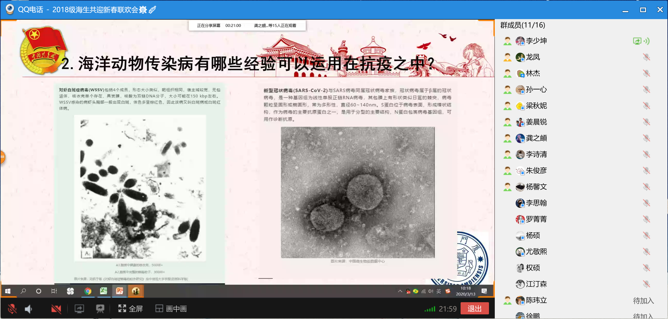 2018级本科海洋生物团支部和2019级本科1班团支部从海洋学科专业知识出发,号召团员青年积极思考“海洋专业能为抗击疫情做什么”。同学们围绕“野生海鲜水产品是否会成为人类重大疾病的传染源?”“在疫情期间如何选择适合的海鲜水产品”以及“如何保护海洋生物多样性”等话题展开热烈讨论。此外,大家还学习了2月24日全国人大常委会关于全面禁止非法野生动物交易、革除滥食野生动物陋习、切实保障人民群众生命健康安全的决定。团员青年们纷纷表示,要充分发挥专业优势,思考如何参与到科研战“疫”中去;同时还要努力从自身做起,积极倡导生态文明建设,让食用野生动物这种陋习成为过去式。