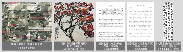 新型冠状病毒感染的肺炎疫情暴发后,许多美丽的“逆行者”奋不顾身地奔赴战“疫”一线,留下感人的背影。第十三届全国美展金奖得主、美术系张玉惠创作漆画《驰援》,描绘了万众一心,驰援武汉的壮观场面;美术系郑盛龙用国画《英雄花开敬英雄》,用寒冬里盛开的英雄花,致敬在各行各业中挺身而出的英雄。美术系连明生在看到中国艺术研究院院长的诗作《礼赞忠诚的白衣天使》后触动极深,一鼓作气将其挥墨写下,“单拳紧握如山令,双手高悬济世壶”,抒发了对医护人员的颂赞;“病毒隔离、爱不隔离,百姓的安危就是无声的命令”,音乐系廖美群与厦门著名词作家朱家麒合作,创作了《众志成城》(武汉疫区救援者之歌),歌颂在这场没有硝烟的人民战争中,忠诚的白衣“战士”。音乐系教师蒋立在观看中央电视台播放的一对医生夫妻在这次抗疫中的真实故事,有感而发,一气呵成完成了原创歌曲《离去的背影》的词曲创作,目前,此作品已被中央电视台《感动中国》节目组征集,并进入MV制作阶段。
