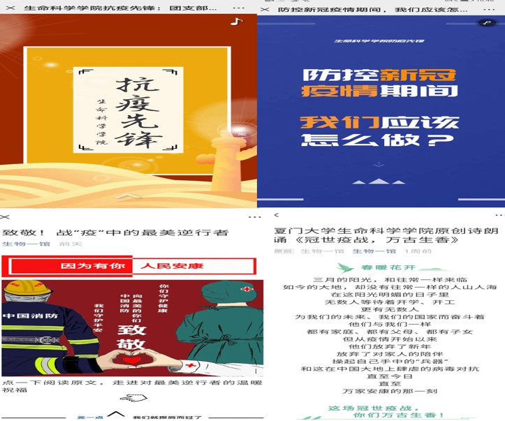 在疫情期间,学院发动团支部、学生会、主持队相继推出一系列原创诗歌、微电影、H5等作品,创新形式开展新颖生动的教育。一批网络文化作品《防控新冠疫情期间,我们应该怎么做?》、《生命科学抗疫先锋:团支部暖心线上行动》、《致敬疫情防控下的“女神们”》、《冠世疫战,万古生香》传递了厦大青年学子的心声。3月5日,师生共同合作的原创诗朗诵《冠世疫战,万古生香》上线生物一馆平台,诗歌从疫情暴发讲到八方驰援、从病毒检测讲到疫苗研制,每字每句都表达了战胜此次疫情的决心。生科青年们虽身在各地,但心向一处,用爱心、用特长、用专业引导青年团员行动起来,用深受青年喜爱的方式唱响家国情怀、责任担当的时代旋律。
