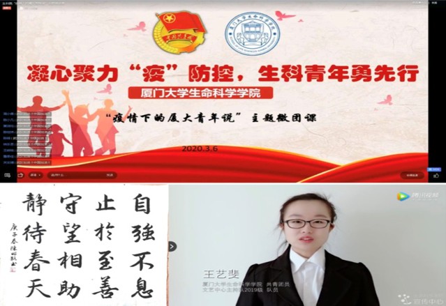 新冠肺炎疫情期间团员教育“不断线”,学院团委精心组织开展“同心战‘疫’ 共克时艰”主题团日活动。活动期间,各团支部利用各种新媒体平台,召开了线上团支部会议,并开展了疫情防控知识线上专题学习。团委还组织各团支部将专题会议、专题学习情况及时上传至“智慧团建”系统,以便通过线上途径了解各团支部思想教育开展情况和支部团员身心健康情况。3月6日,学院举办了一场主题为“凝心聚力‘疫’防控,生科青年勇先行”特殊的线上微团课,以网络直播的形式通过“疫情下的厦大青年说”呈现,本次微团课邀请我院新冠肺炎核酸检测试剂盒研发团队许晔副教授作为主讲嘉宾,为青年团员们讲述研发新冠肺炎核酸检测试剂盒背后的使命与担当。开课的同时主会场还连线此时坚守在实验室进行科研攻关的同学们和正在外地团员青年们,分享他们在疫情当下的点滴故事,同学们纷纷表示作为一名青年学生、一名生科学子要以责任担当和科学精神做好力所能及的事情。2017级本科生宋文婕在观看完微团课直播后激动的留言:今天的微团课让我感受颇多,致敬奋斗于战役一线的每一位工作人员,致敬仍在学校默默工作的科研工作者,也要为这批青年力量加油!