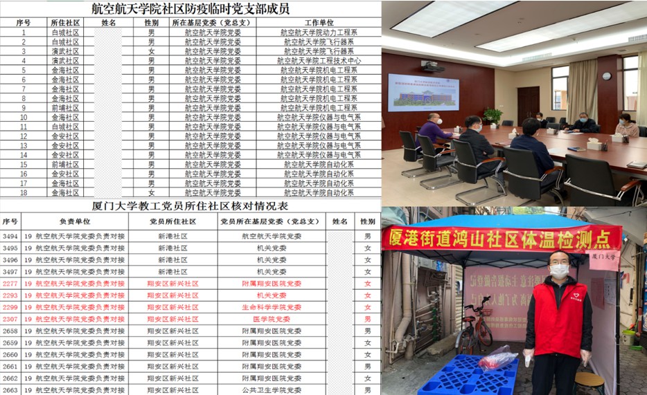 在学院党委的组织号召下,教工党员以战“疫”践行初心使命,纷纷戴上党徽、穿上马甲,前往所在社区承担防疫任务,参与党员覆盖7个教工党支部。仪器与电气教工党支部副书记何良宗、机电工程教工党支部副书记赵扬带领支部10名党员参与社区防疫工作。工程技术教工党支部宣传委员刘万山在阴雨降温且没有帐篷遮挡的情况下坚持在岗服务,获得了演武社区和居民的好评。动力工程教工党支部书记黄玥、飞行器教工党支部宣传委员朱呈祥、自动化教工党支部党员邵桂芳等在社区服务的同时,与工作人员进行沟通交流,缓解其长期在岗的身心压力。刚刚成为正式党员的仪器与电气教工党支部王昕主动报名参与金安社区防疫工作,与学校其他单位的11名老师一道处理完成8000多条住户信息。行政教工党支部蔡鹏程、范林溪、贾君、王坤等党员分别在学校食堂、校车站点等地进行体温测量工作,身体力行筑好坚强防线、守护平安校园。