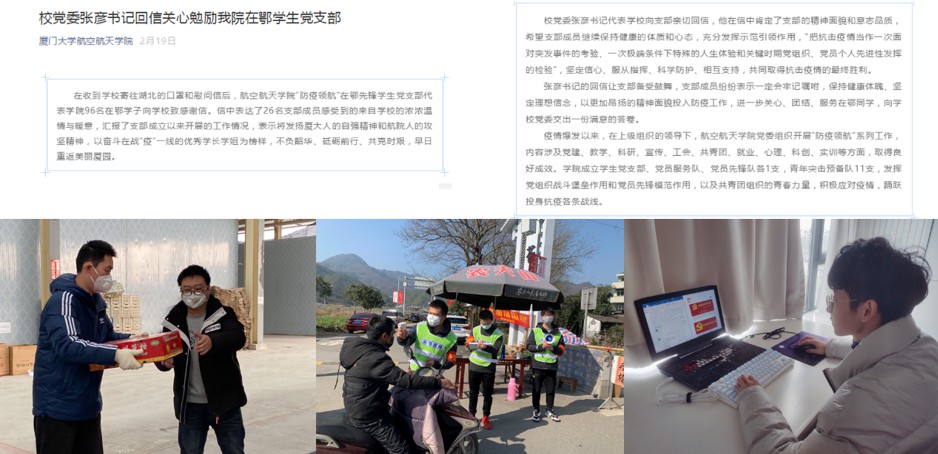 在当前防控新冠肺炎疫情的严峻斗争中,航空航天学院党员师生坚定、执着而美丽的身影不断涌现。全院党组织、党员坚决贯彻习近平总书记重要指示精神和党中央、国务院决策部署,不忘初心、牢记使命,充分发挥战斗堡垒和先锋模范作用,在关键时刻挺身而出、英勇奋斗、扎实工作,团结带领全院师生共同打赢疫情防控阻击战。