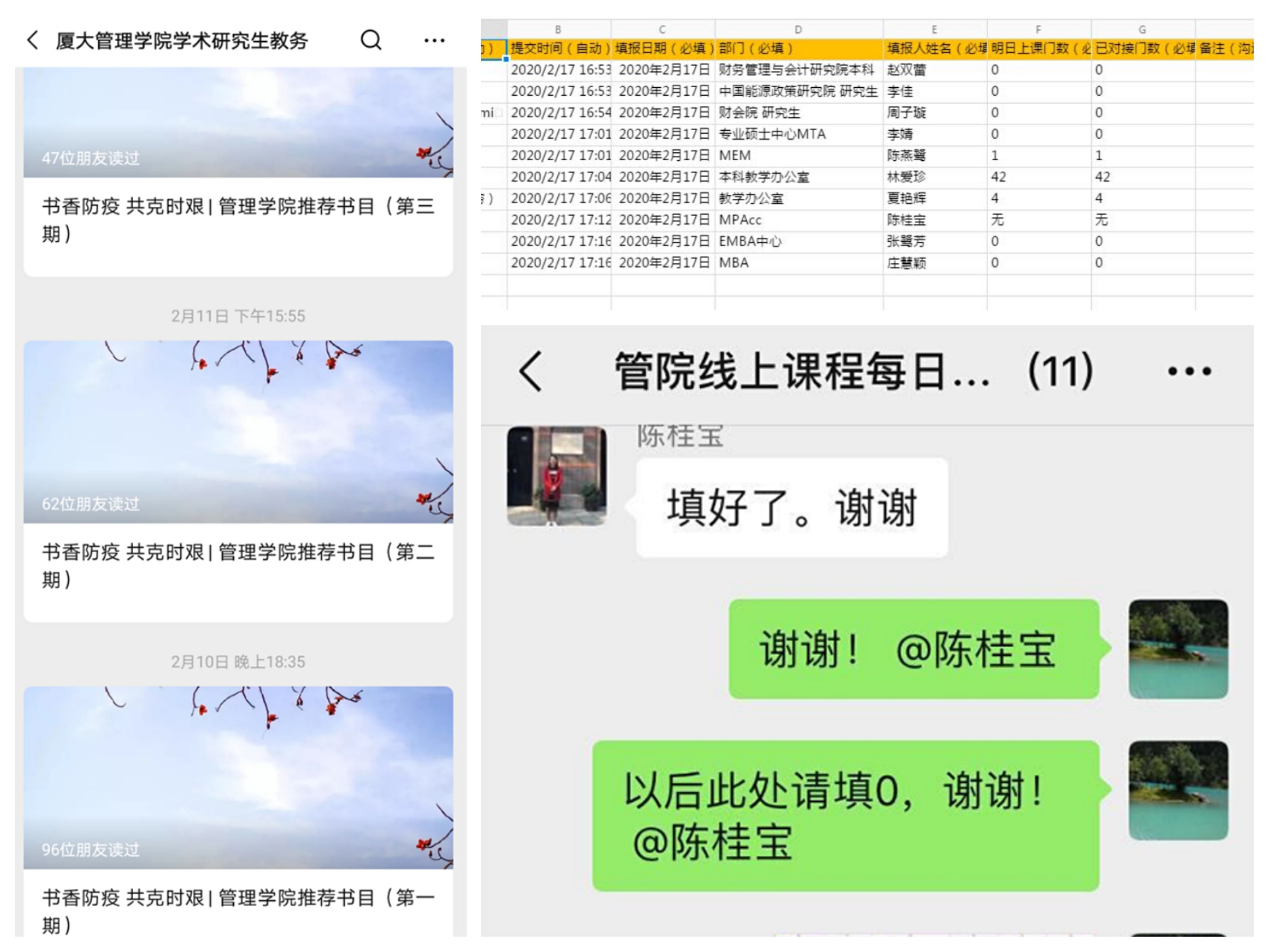准备工作随即展开。学院教学办公室同步通知、协助任课教师在厦门大学课程中心平台建课、上传教学资料,实时将平台直播培训内容、操作指南等通知到每一位任课老师,解决教师导入选课学生名单等课程准备中遇到的问题,并就课程上网情况与每位教师确认线上教学方案。任课教师发起课群邀请查漏补缺、教学秘书汇总信息第一时间向全院公布,仅一天管理学院春季学期151门课程群组全部建立完毕。学院辅导员在做好《形势与政策》思政课授课任务的同时,全员参与摸排学生家庭网络情况并实时反馈信息,督促全体学生及时加入课群,积极帮助联系解决学生存在的困难,全力保障在线教学组织与管理工作。学院就教学条件要求较高的实验课适时调整教学方案,充分利用学院资源及和国家虚拟仿真实验教学项目共享服务平台开展线上教学。并就当前难以开展的毕业实习要求调整延期放方案,准确掌握毕业班292名学生实习情况,同时向学生家长一一传到暂停实习信息。151个课程群组迅速开设,151门课程及时上线,实验课程合理安排,毕业实习调整延期,管理学院努力做到“课程门门都落实”,为确保线上开学顺利有序做足准备。